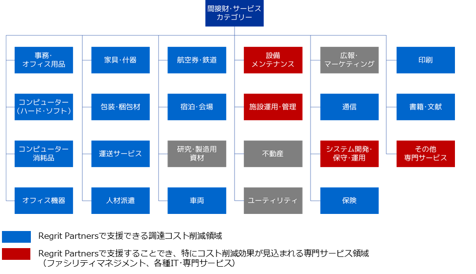 サービス(=コト)の領域は、サービス仕様やサービス単価、契約スキームの見直し等、財(=モノ)に比べて検討すべき項目が多く且つ複雑であるため、社内組織だけで検討を進めることが難しく、見送られていた領域となります。それ故、本来削減できるはずのコスト削減を実現できていないケースが多く存在し、大幅な改善効果を生む可能性を秘めています。