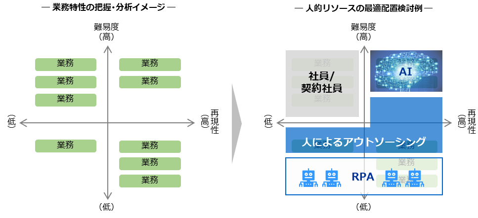 人的リソースの最適配置を検討する大まかな手順としては、対象となる事業や部門の方針・戦略を理解したうえで、オペレーション全体の観点からコア業務・ノンコア業務の切り分け、業務特性の把握・分析を実施し、最適なリソースの選定と配置を全体感を持って検討していく必要があります。