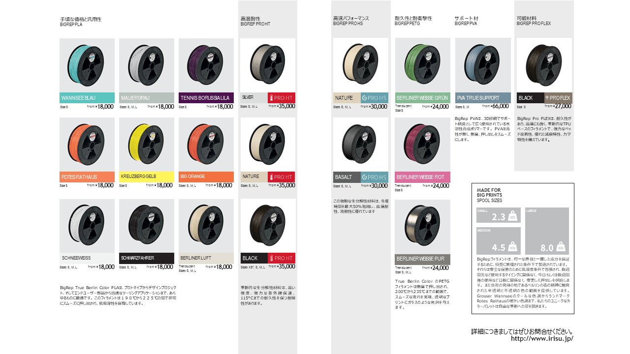 尚、3Dプリンターを活用する業界の幅は年々広がっており、製造業界や自動車業界はもちろん、教育、ファッション、通信、医療業界など多岐にわたっています。現在、人気機種の大型3DプリンターBigRep ONEの売れ行きが好調のイリスは今回のキャンペーンでさらなる販路を拡大したい考えです。