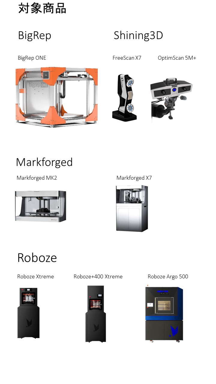 人気機種の大型3DプリンターBigRep ONEや新しく代理店となったイタリアの3DプリンターRobozeの最新機種も対象商品になるなど、同社では前例がない初の試みで、業界内でも反響が大きく、話題を呼んでいます。