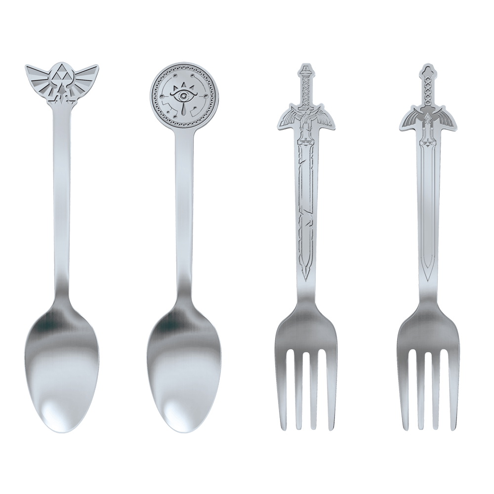 2種類のマスターソードと、ハイラル紋章やシーカーアイがデザインされたフォークとスプーンです。