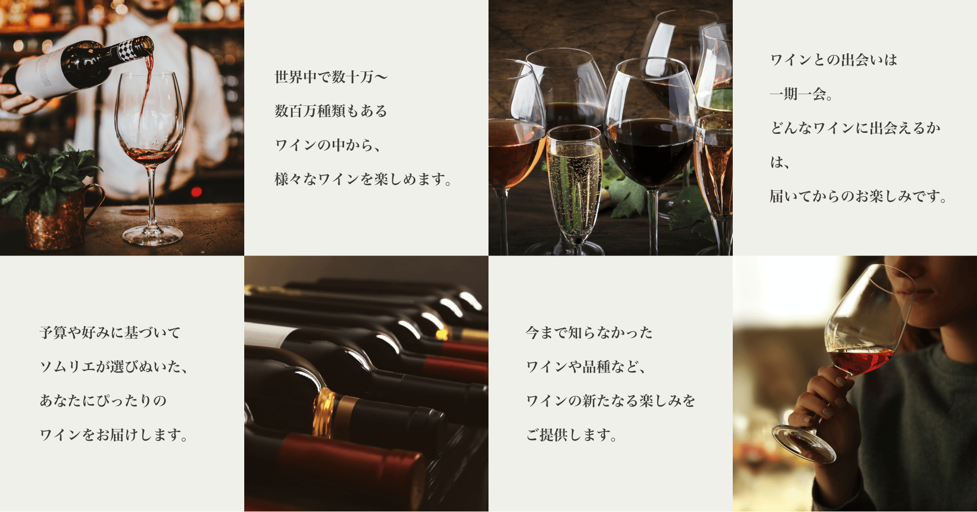 ワインに興味はあるが自分でワインを選べない、あるいはワインが好きだが自分で選ぶのが面倒だ、もしくは自分の知らない自分好みのワインに出会いたいという方が、簡単手軽に最適なワインを購入できます。