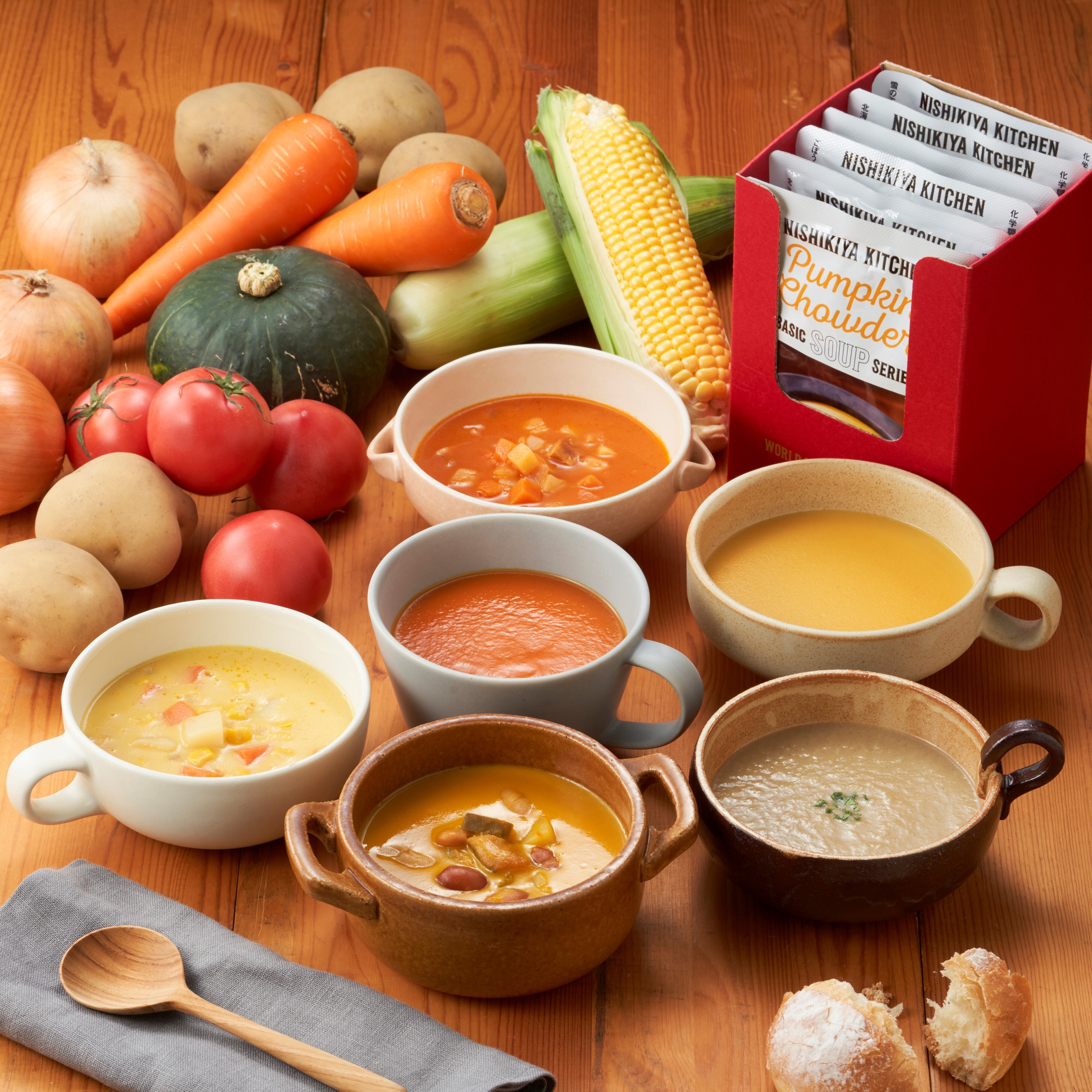 北海道産かぼちゃのチャウダー、北海道産スイートコーンのチャウダー、国産トマトクリームチャウダー、コーンポタージュ、ふかうら雪人参ポタージュ、ごぼうポタージュ