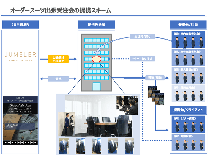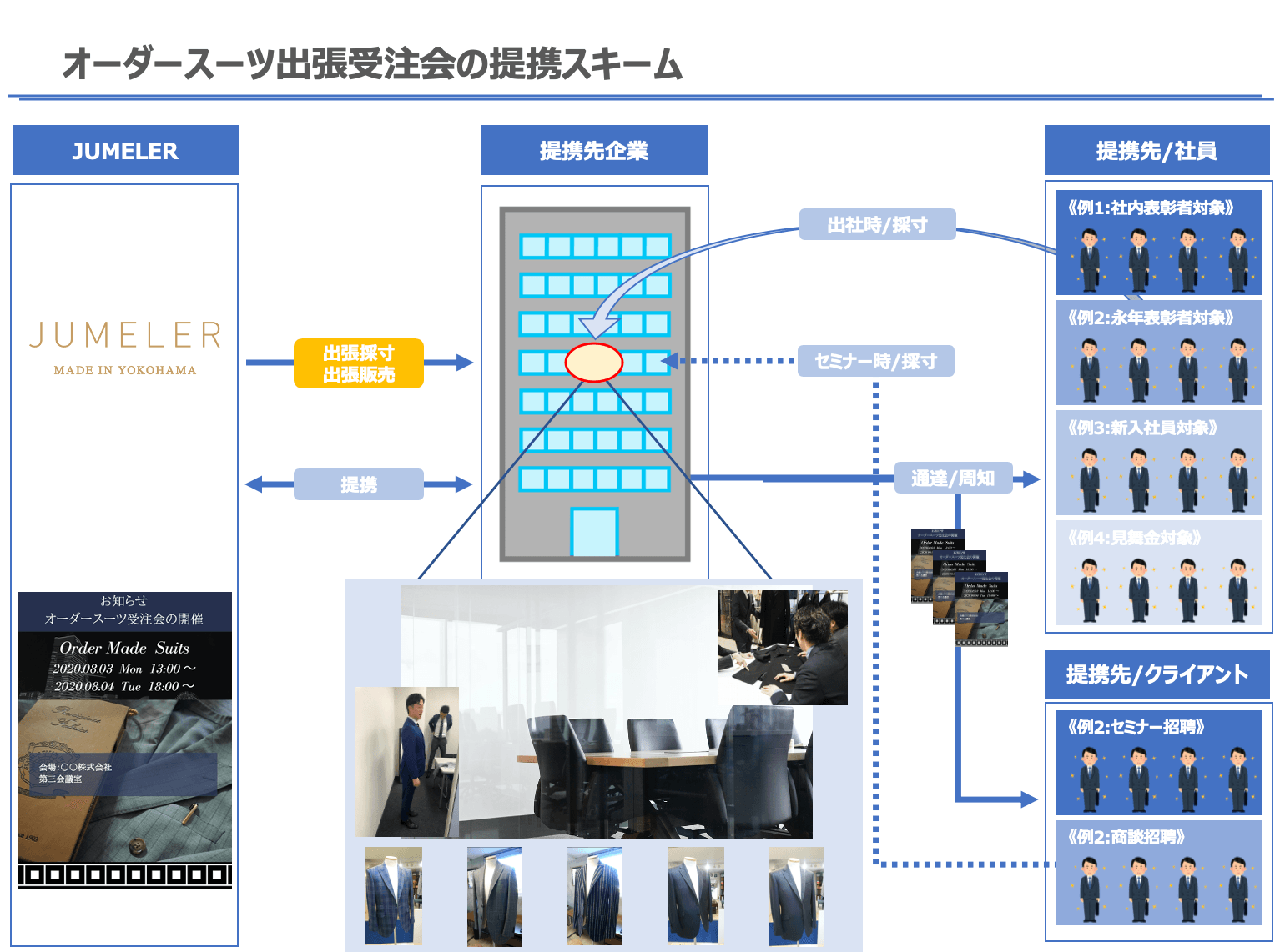 本キャンペーンは、JUMELER(ジュムレ)が提携先の企業に出向き、従業員及び提携先企業のクライアントを対象とした『オーダースーツ出張受注会』を限定開催するという新たなサービスになります。