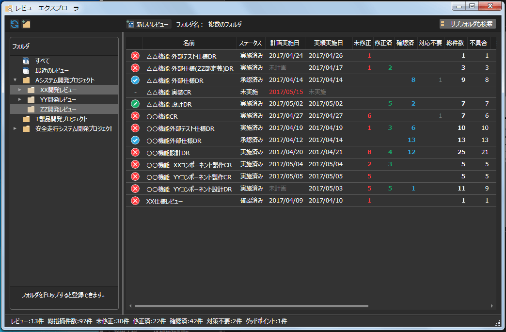 複数のレビューの指摘データが、専用のピボット分析ツールで自由に集計できます。開発対象のモジュール別、機能別、あるいは工程別といった視点で指摘データを分析することで、品質上注意すべき対象が見えてきます。また、プロジェクト内のレビュー実施状況をまとめて把握することも可能です。