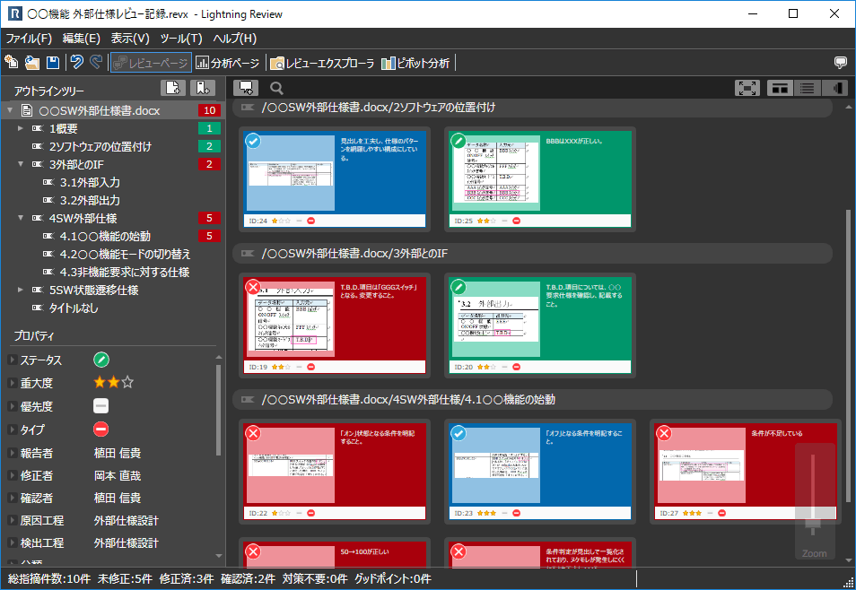 指摘の登録状況や修正の進捗状況が、未修正は赤・修正済みは緑などステータスごとに色分けされたアイテム一覧で視覚的に管理できます。要修正項目の対応漏れの有無も簡単に確認できます。