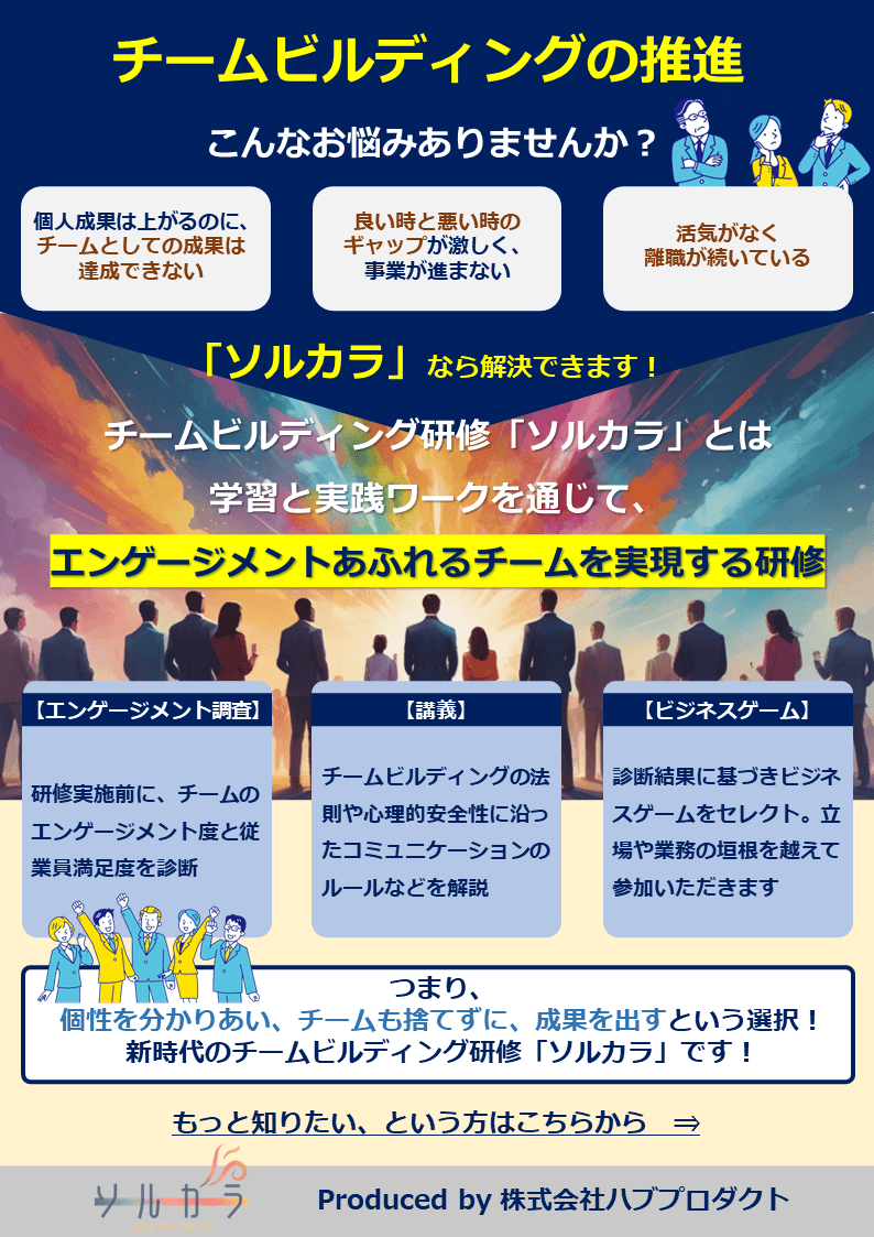 株式会社ハブプロダクト(本社:東京都渋谷区、代表取締役:細野 和彦)は、個性を活かしながら結果も出すチーム作りを目指した、自分たちでチーム色のある解決策(解決色)が沸くような研修「ソルカラ(Solution Color)」について、2024年7月26日からサービスの提供を開始いたします。