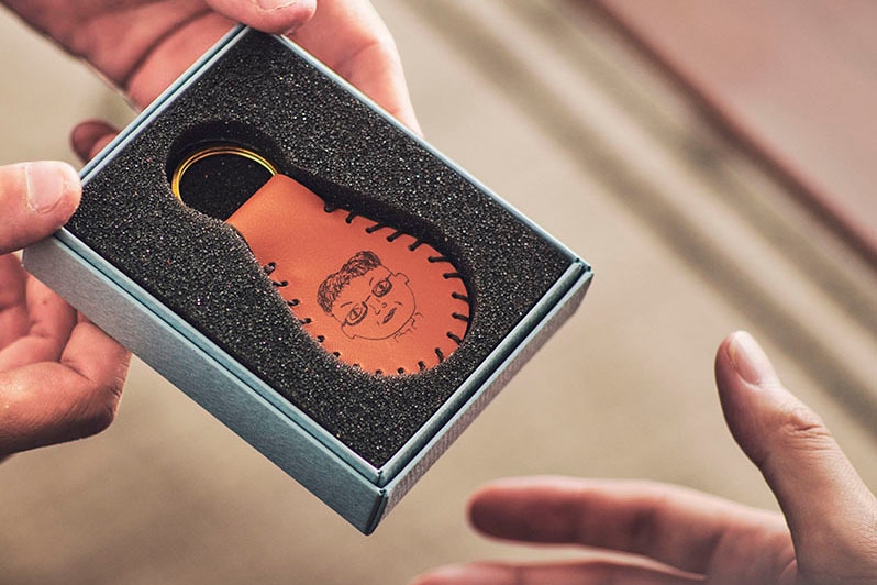 「一番印象に残る嬉しいプレゼントはやっぱり思いがこもった手作りのプレゼント。そこで私たちが考えた商品は似顔絵レザークラフトキットです。プレゼントを贈りたい人の似顔絵を描いてデータを送り、後日似顔絵がプリントされた革でキーホルダーを作成したらプレゼント。
