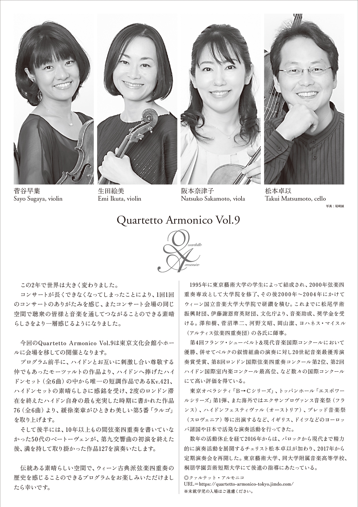 クァルテット・アルモニコ: 菅谷早葉(Vn)、生田絵美(Vn)、阪本奈津子(Va)、松本卓以(Vc)