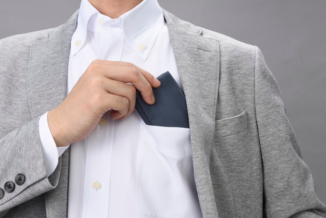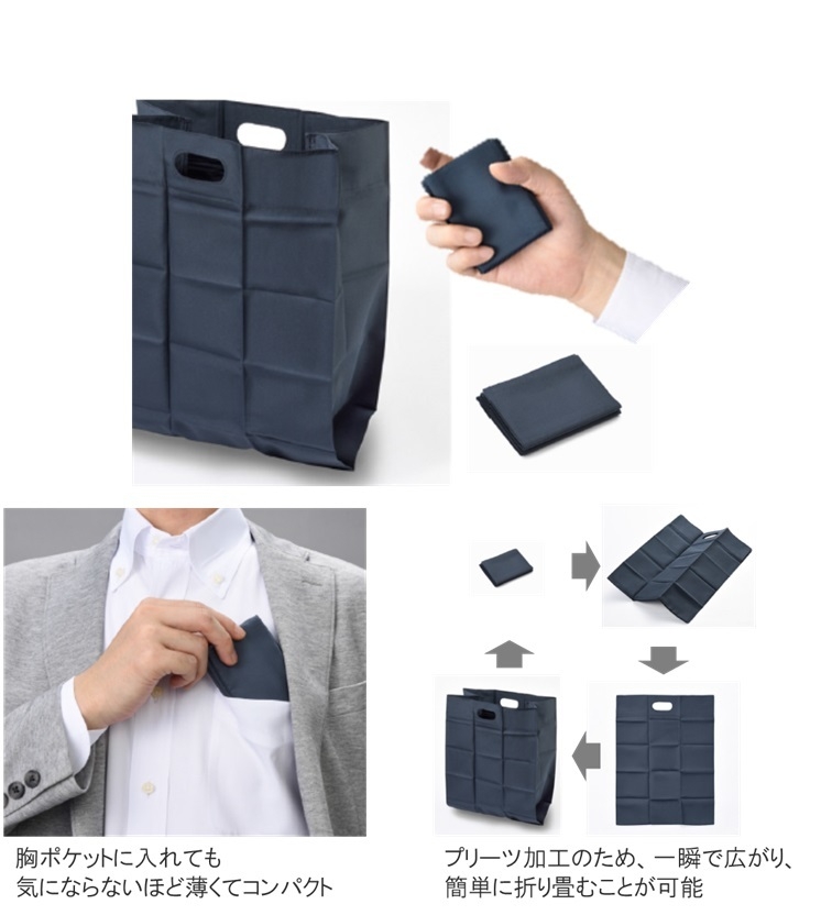 環境問題への関心の高まりにより、エコバッグを持ち歩く「エコ」を意識した生活スタイルへの変化が求められております。市場で販売されているエコバッグは、普段、手ぶらで持ち歩くにはサイズが大きく、カバンのなかでも場所をとっていました。「ポケットスクエアバッグ」は、折り畳むと洋服の胸ポケットに入れても気にならないほど薄く、コンパクトになるにもかかわらず、広げるとコンビニエンスストアなどのちょっとした買いものでも十分お使いいただける容量をもったエコバッグです。ポケットチーフのような感覚で、日常的に持ち歩きしたくなるお洒落なデザインが特長です。