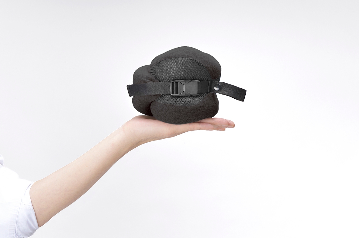 一般的なトラベル用の低反発ピローは、クッションの使い心地は良いものの、重く、かさばるといった声が多くありました。「低反発ピロー“かるラクーン”」は、本格的な低反発クッションでありながらも、最低限の面積で首回りをしっかりフォローする形状を追求し、重さはわずか240gです。また、簡単に丸めて手のひらサイズとなり、付属のショルダーポーチに収納することができるため、持ち運びにも便利です。