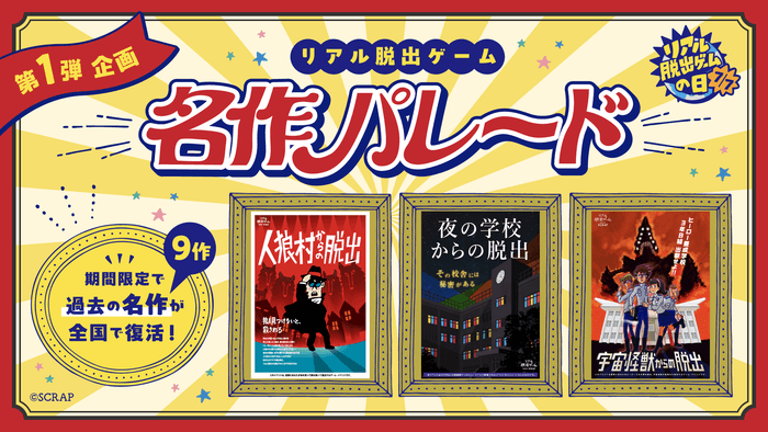 全世界で累計1,490万人以上を動員しているリアル脱出ゲームを企画制作する株式会社SCRAP(本社:東京都渋谷区、代表:加藤隆生)は、7月7日の「リアル脱出ゲームの日」を記念したさまざまな企画を実施します。第1弾として、過去の名作イベント全9作品が期間限定で復活する「リアル脱出ゲーム名作パレード」の開催を発表いたします。