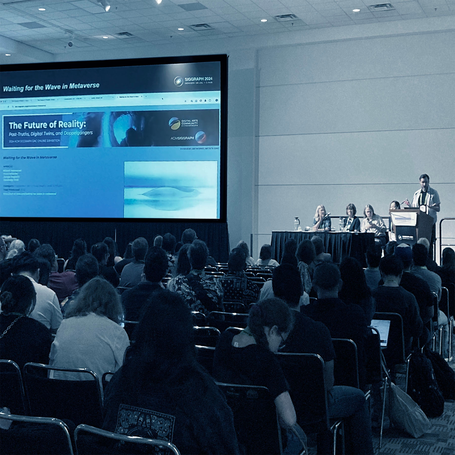 SIGGRAPHは、1967年に発足したコンピュータグラフィックスとインタラクティブ技術に関するプレミアカンファレンスおよび展示会で、学術的研究、アート、アニメーション、ゲーム、インタラクティブ技術、教育など、あらゆるCGに関する最先端が集結し、技術分野とクリエイティブ分野で活躍する世界中の業界関係者が数多く参加する、世界最大かつ最高のCGの祭典といわれ、2024年度はアメリカのコロラド州デンバーの、コロラド コンベンションセンターで開催されました。また、ACM SIGGRAPH Digital Arts Communityは、デジタル、電子、計算、メディア アートの分野で、年間を通じて、アーティストとコンピュータグラフィックス及びインタラクティブ技術の、コミュニティ間のコラボレーションを促進して、研究とクリエイティブなプログラムを推進しており、SIGGRAPH 2024では「The Future of Reality: Post-Truths, Digital Twins, and Doppelgangers」をテーマとして、デジタルアートのオンラインエキシビション及び発表を行いました。そして今秋にはさらに、選出されたアーティストによるオンラインセッションの開催を予定しています。