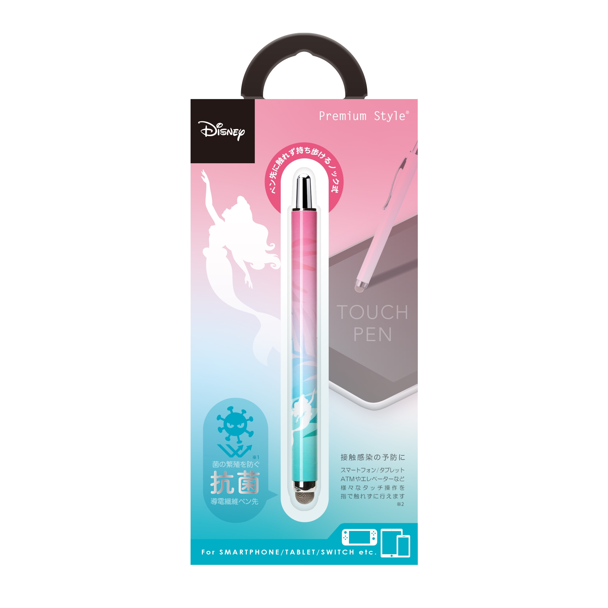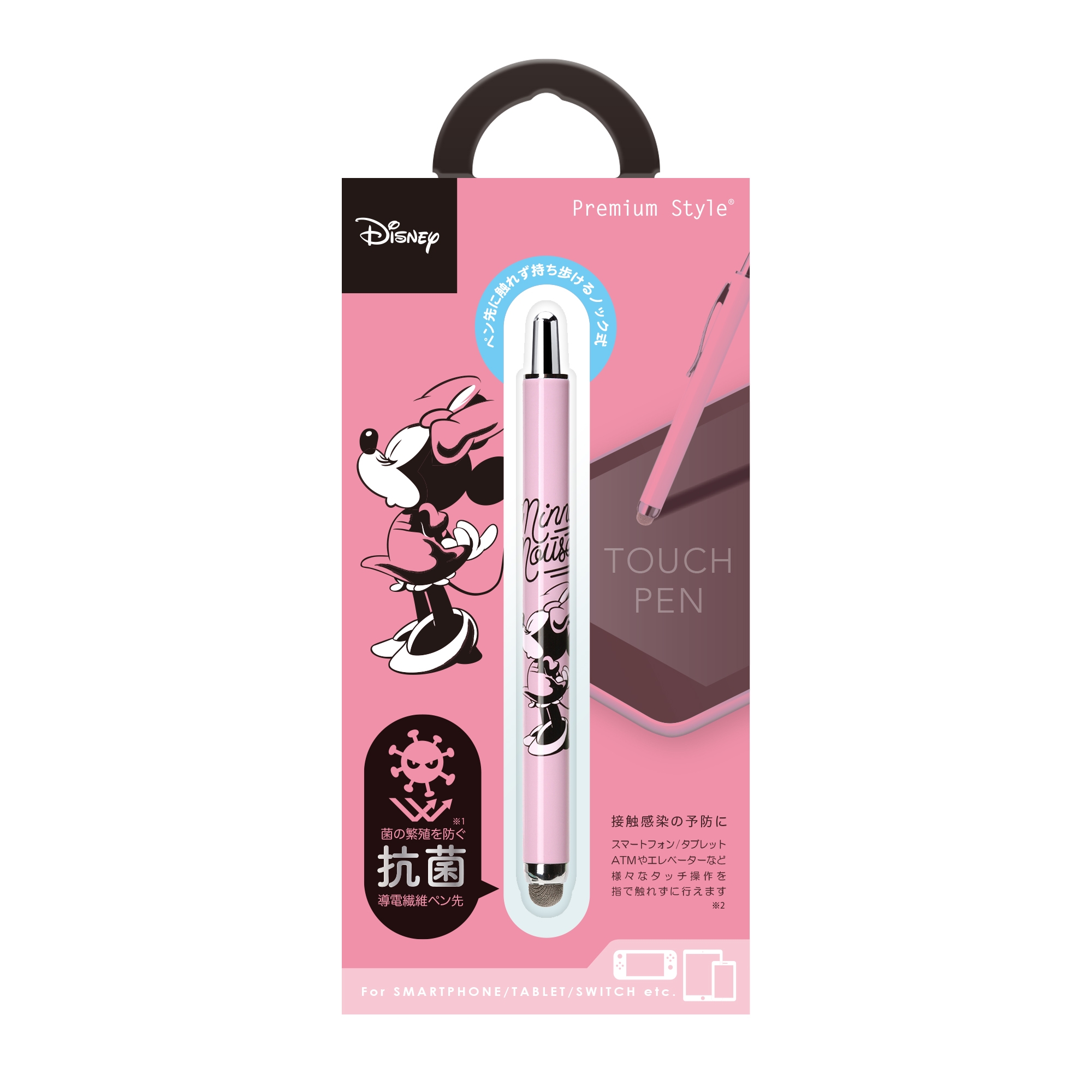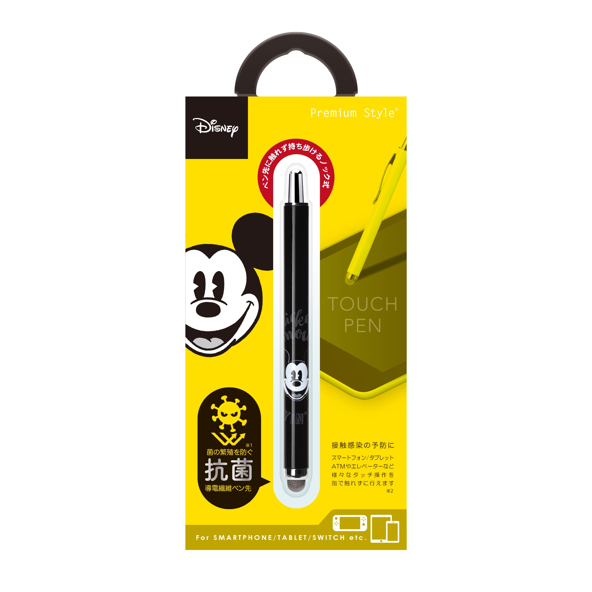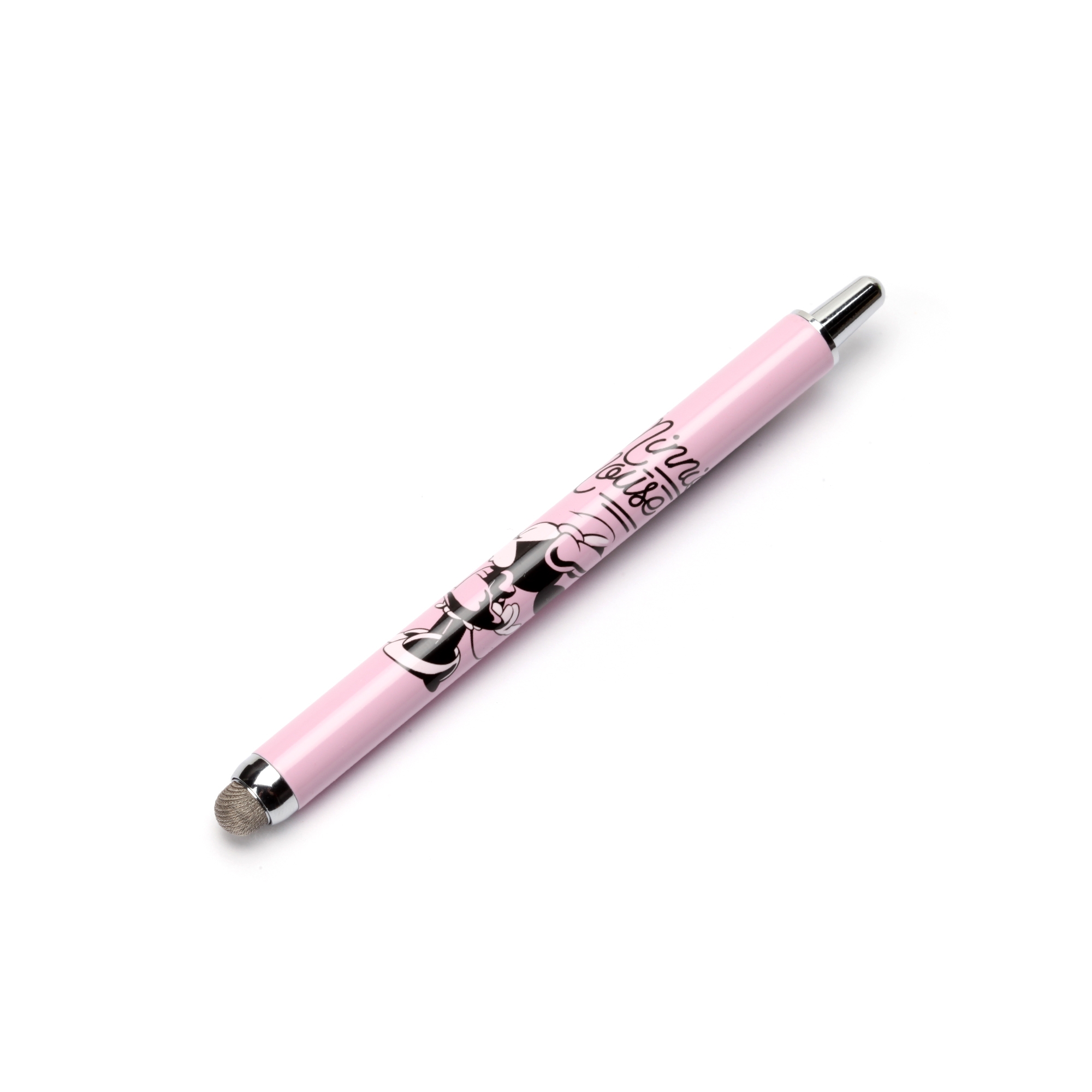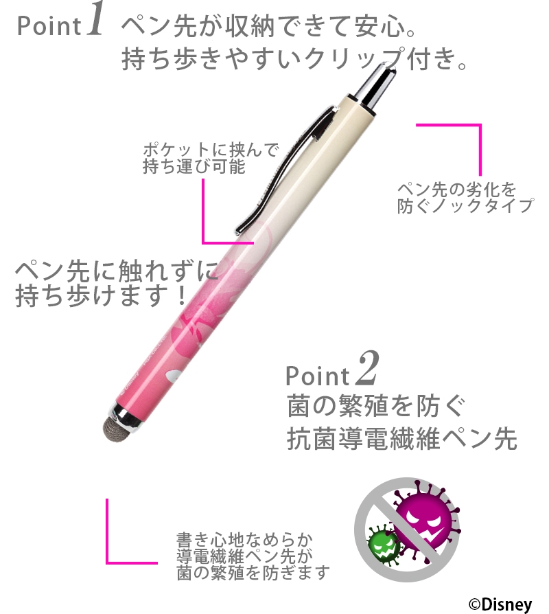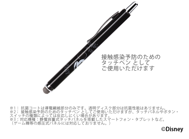 ディズニーキャラクターデザインのスマートフォンやタブレット、ATMやエレベーター等日常生活の様々なタッチ操作を指で触れずに行えるノック式タッチペンです。ペン先は菌の繁殖を防ぐ抗菌仕様。また、導電繊維を使用しているのでイラストや文字を書く際には滑りの良い、サラサラとした書き心地を楽しめます。ノック式仕様でペン先の劣化を防ぎ、片手で簡単収納が可能です。胸元のポケットや小さなショルダーバッグに入れて持ち運びにも便利な太さ9mmのコンパクトサイズ。