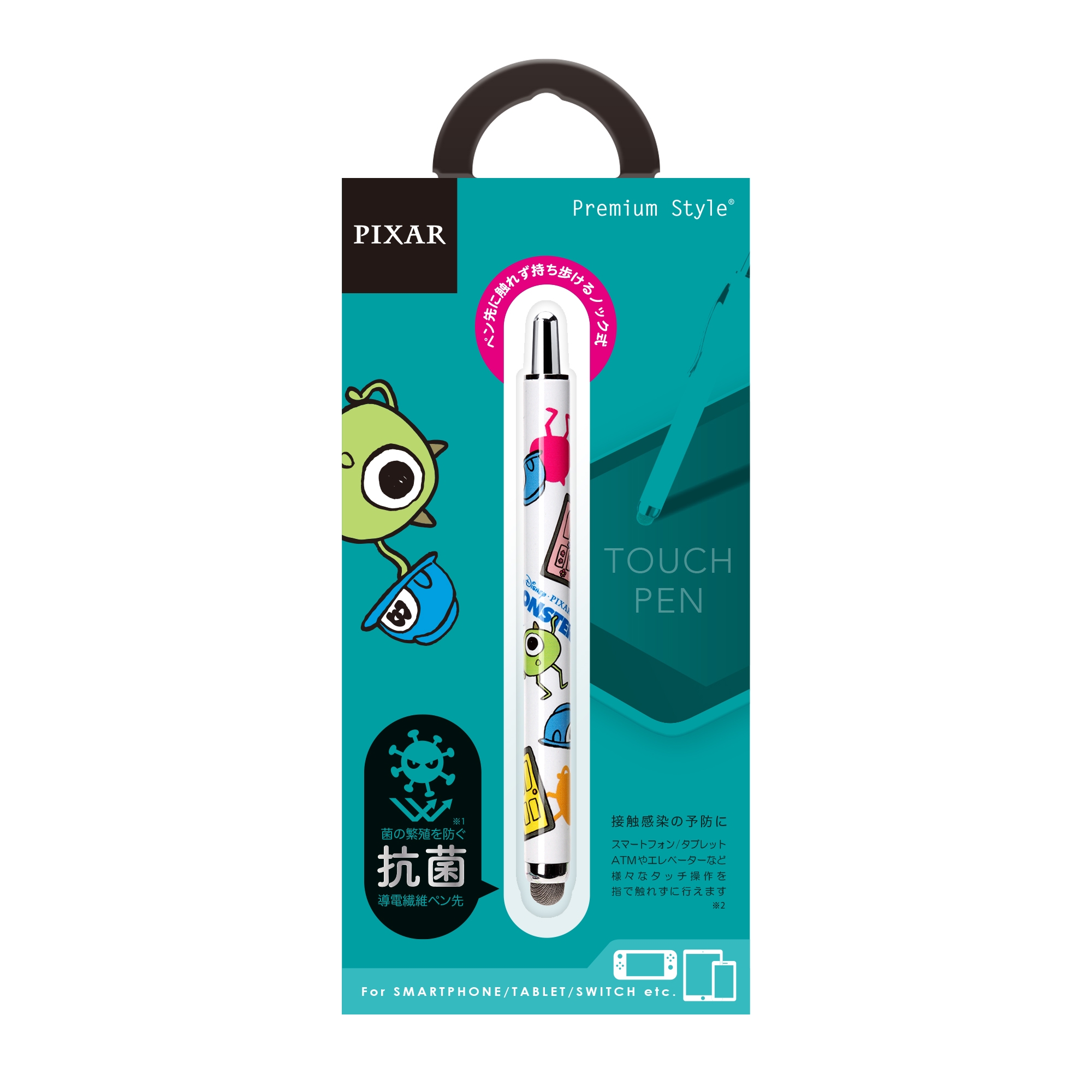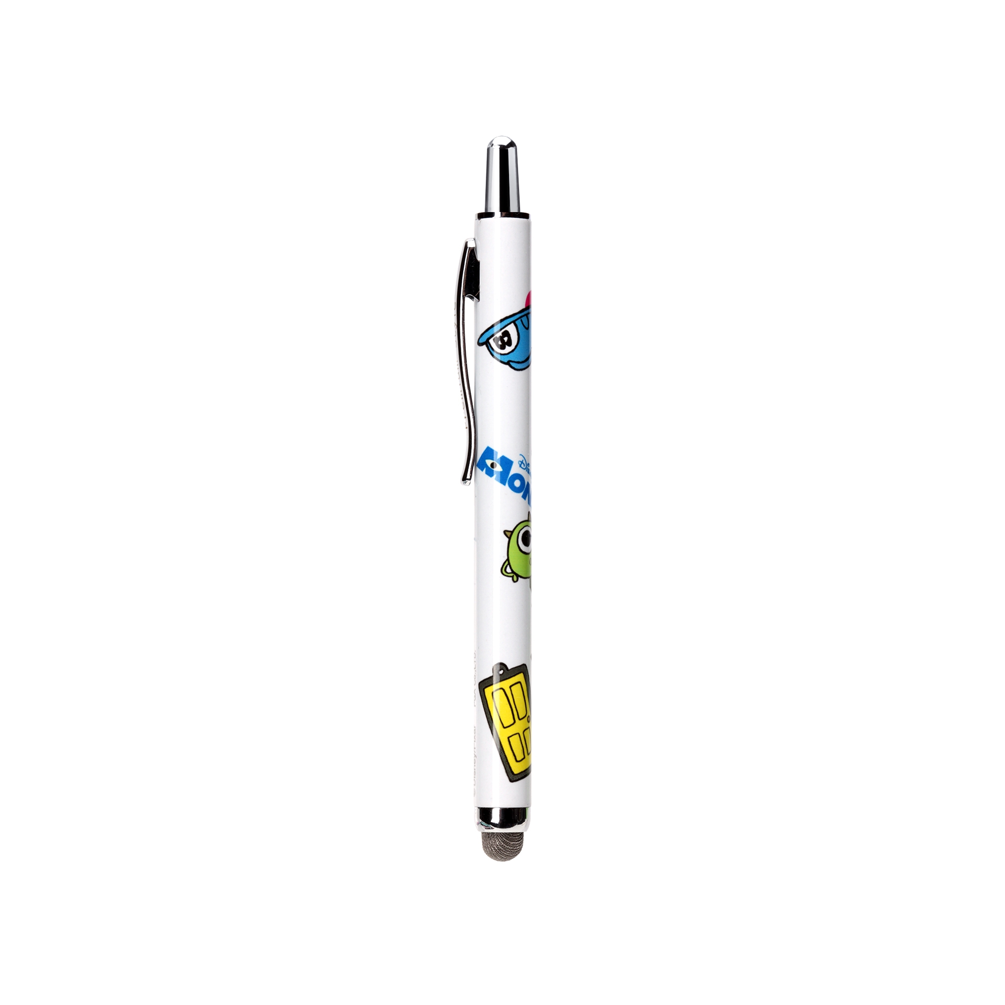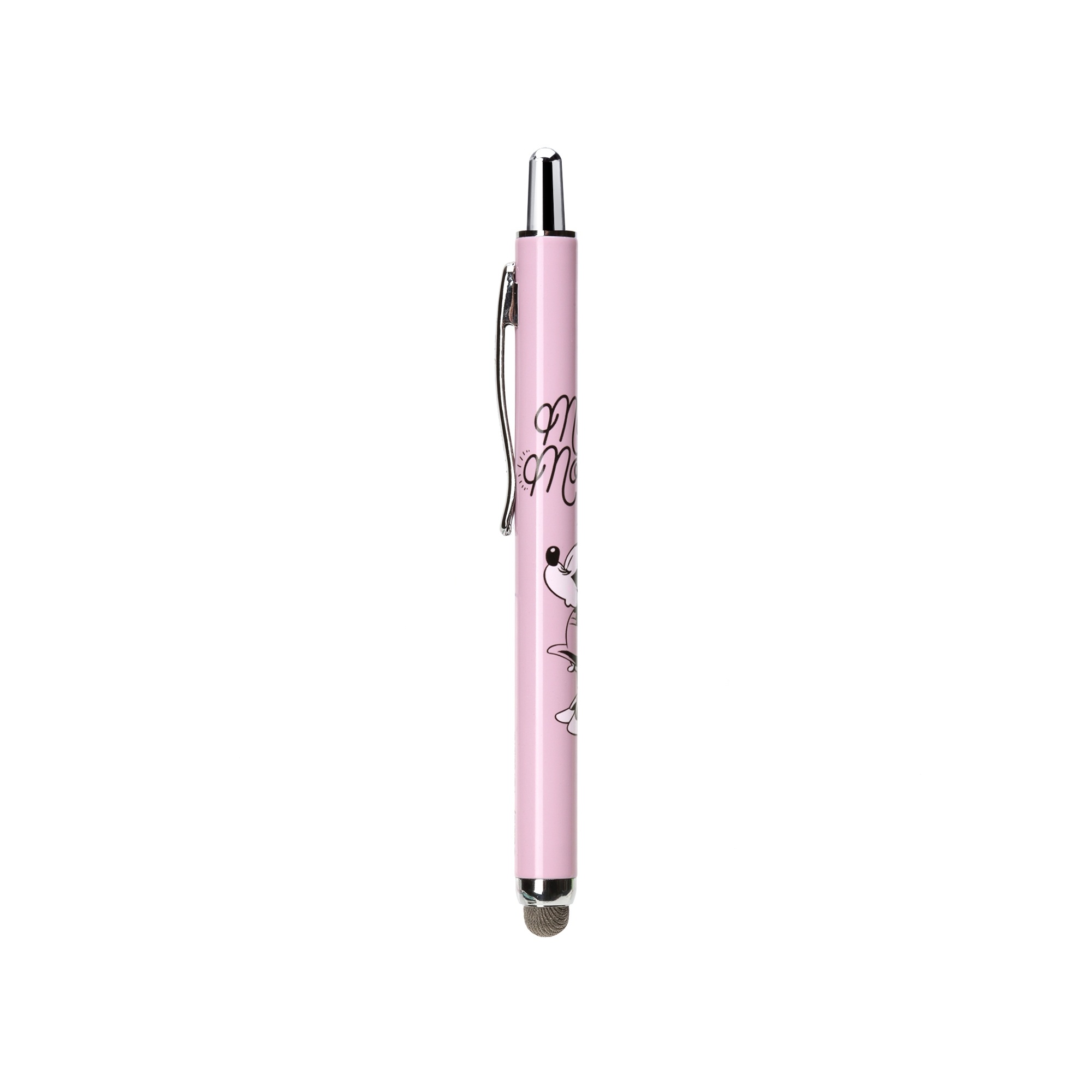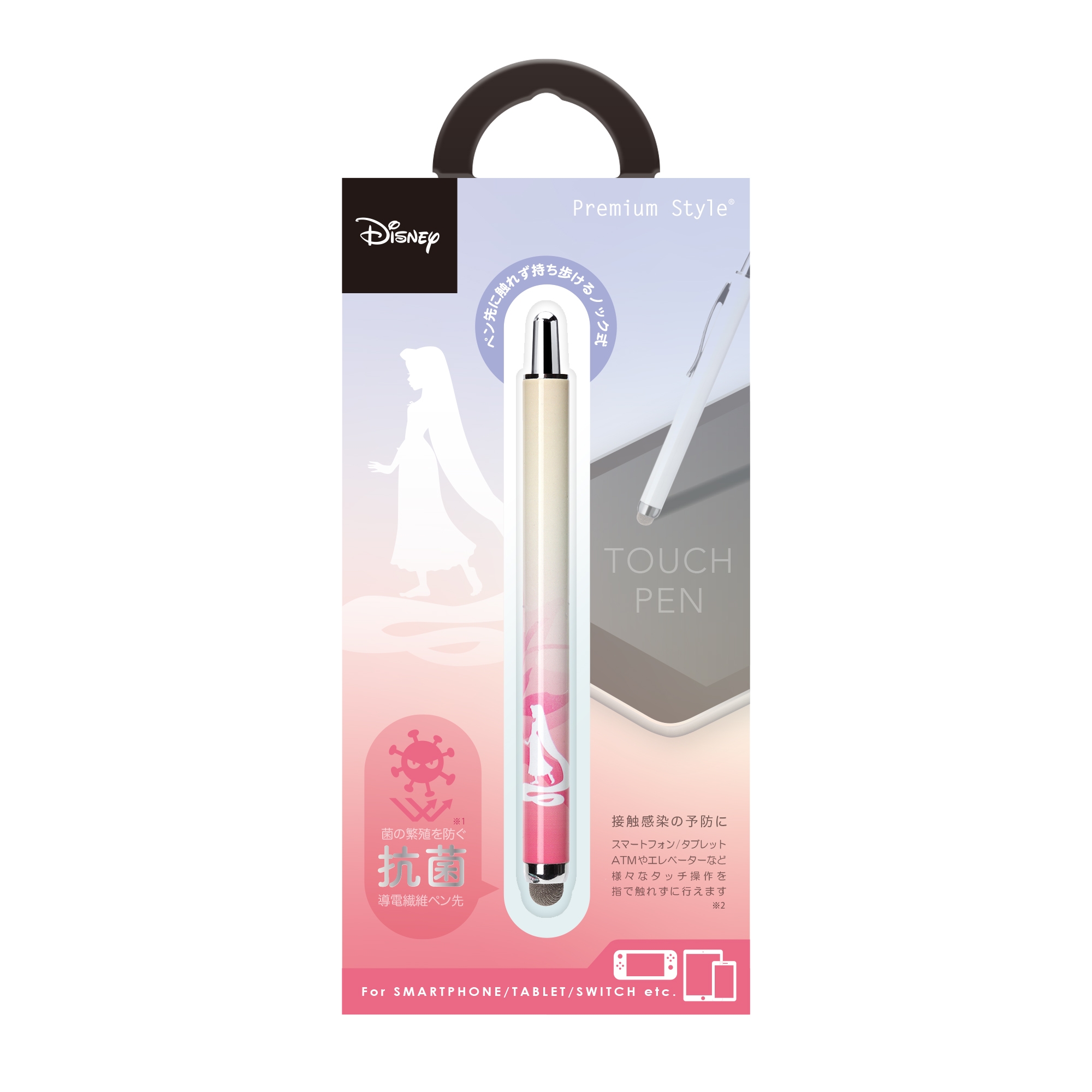 ディズニーキャラクターデザインのスマートフォンやタブレット、ATMやエレベーター等日常生活の様々なタッチ操作を指で触れずに行えるノック式タッチペンです。ペン先は菌の繁殖を防ぐ抗菌仕様。また、導電繊維を使用しているのでイラストや文字を書く際には滑りの良い、サラサラとした書き心地を楽しめます。ノック式仕様でペン先の劣化を防ぎ、片手で簡単収納が可能です。胸元のポケットや小さなショルダーバッグに入れて持ち運びにも便利な太さ9mmのコンパクトサイズ。