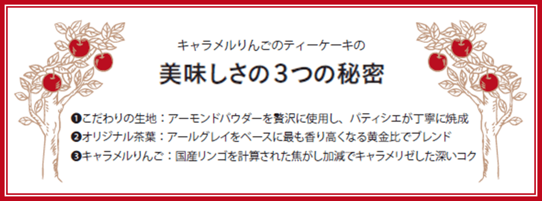 厳選したアーモンドパウダーや自社オリジナルブレンドの茶葉を混ぜ込んだパウンドケーキ生地の表面に、キャラメリゼした国産りんごと小さくカットしたピスタチオを飾り付けしました。紅茶の程よい苦味とりんごの優しい甘みが調和する至極のティースイーツに仕上がりました。