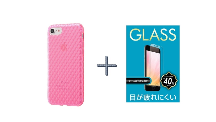 ダイヤモンドカット クリアケース/ピンク +ブルーライトカットガラスフィルムセット