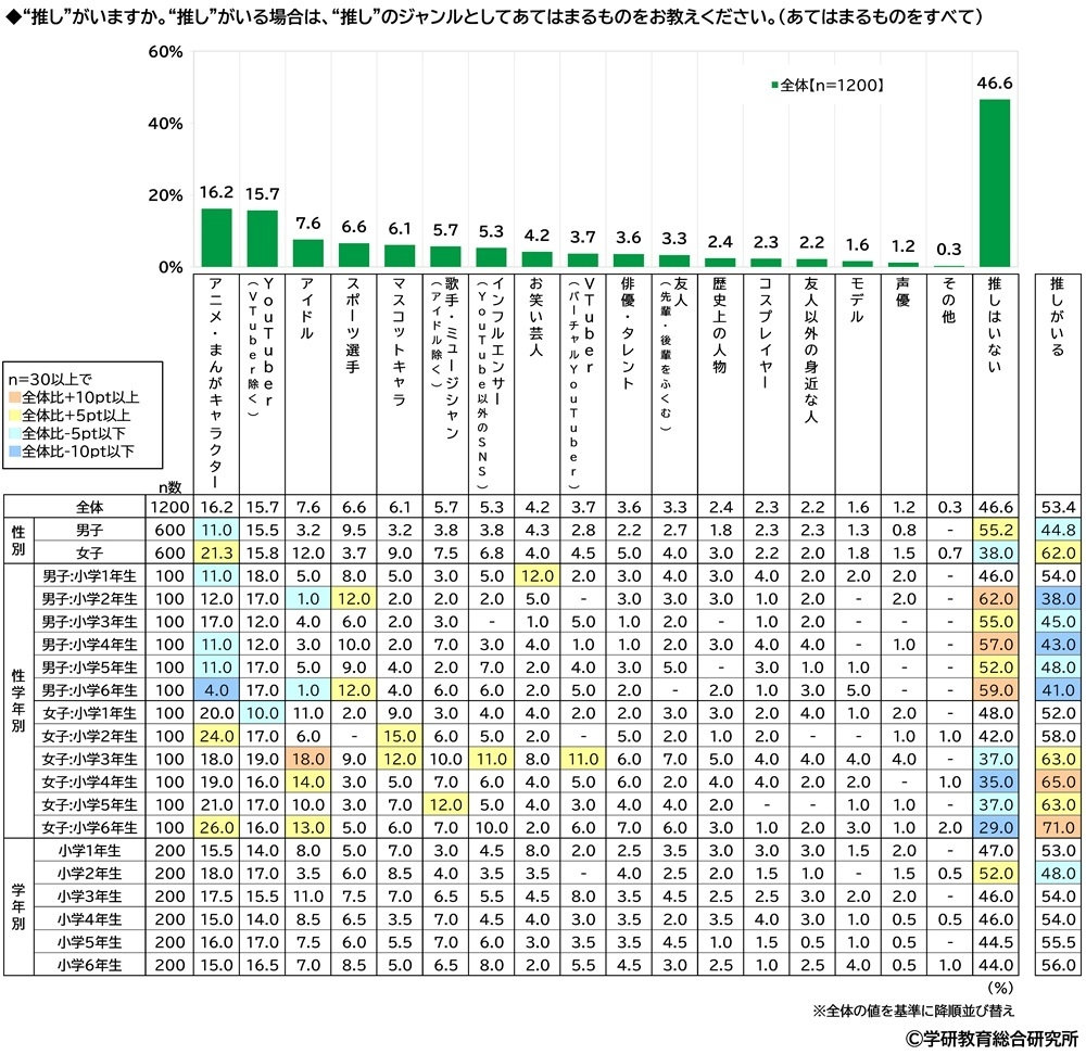 学研教育総合研究所調べ 「“推し”がいる」 小学生53%、中学生62%、高校生71% “推し”のジャンル1位は? 小学生男子と高校生男子は「YouTuber」、 中学生女子と高校生女子は「アイドル」、 小学生女子と中学生男子は 「アニメ・まんがキャラクター」