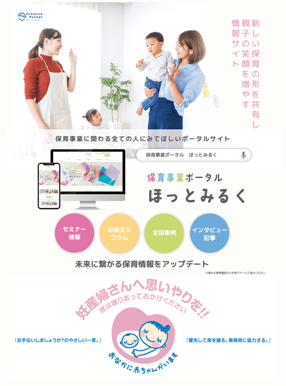 CreativePocket株式会社(東京都新宿区西新宿、代表取締役 福田慎也)は、運営する保育事業者向け情報メディア「保育事業ポータルほっとみるく」と「マタニティマーク」のタイアップ広告を都営地下鉄大江戸線にて掲出します。