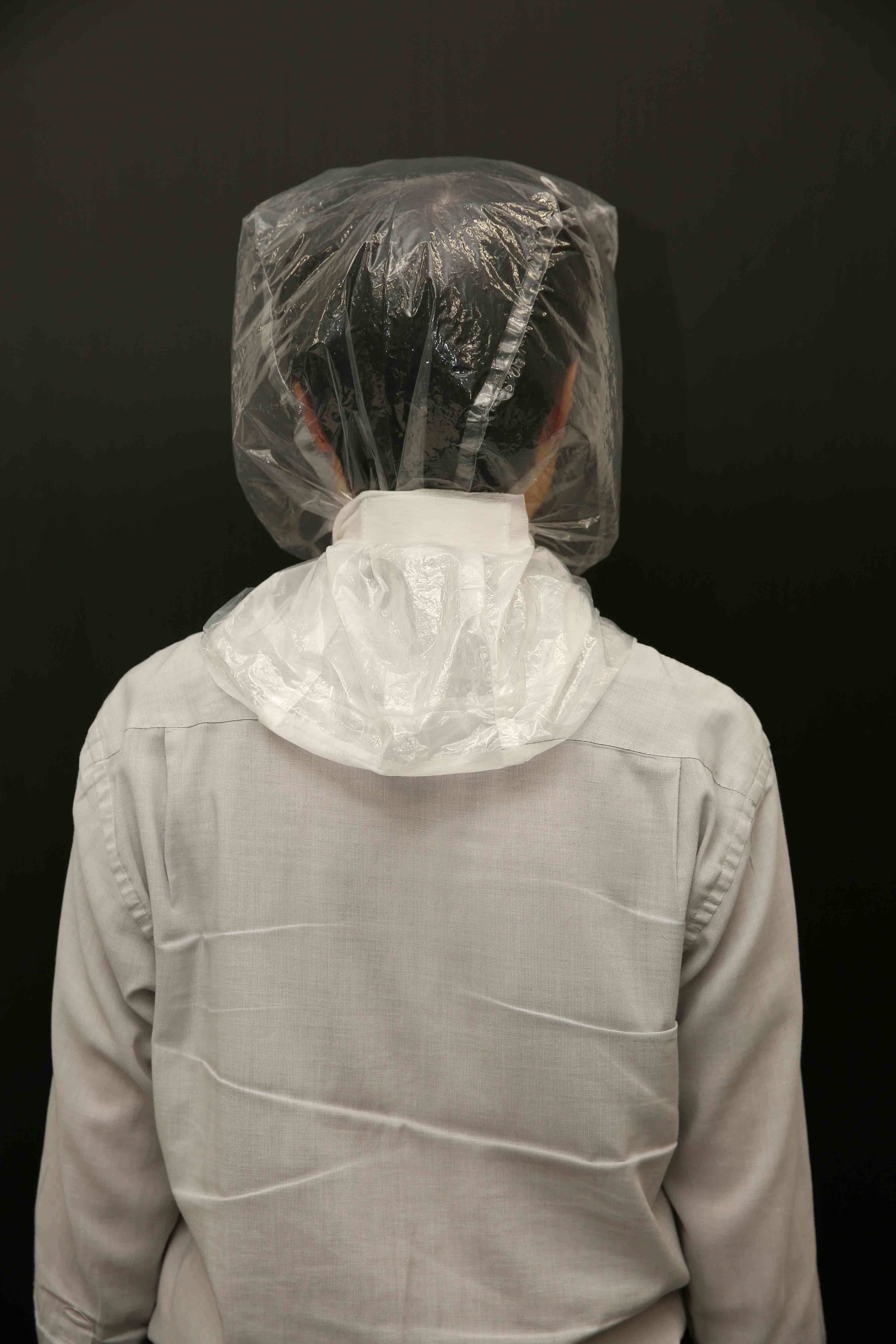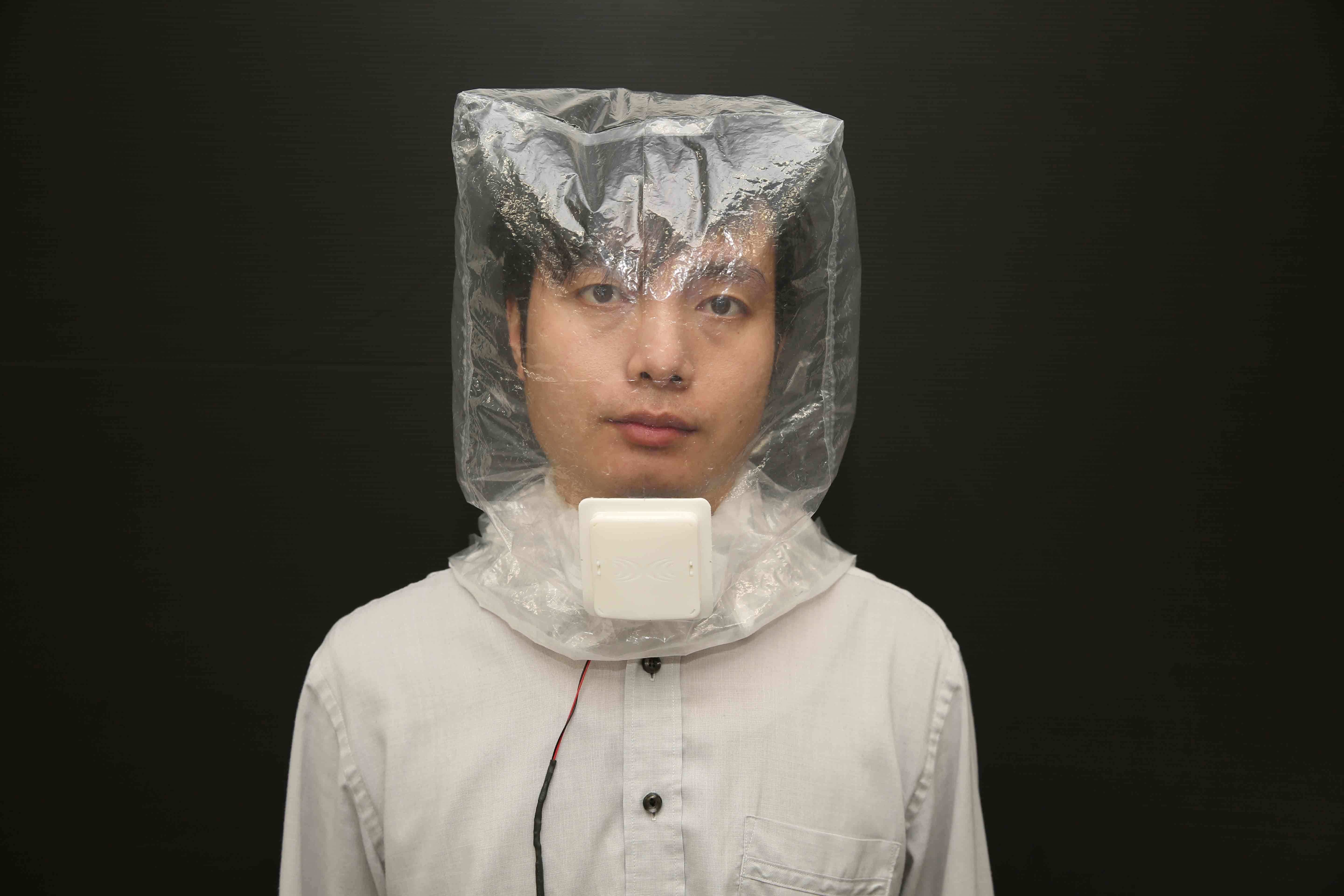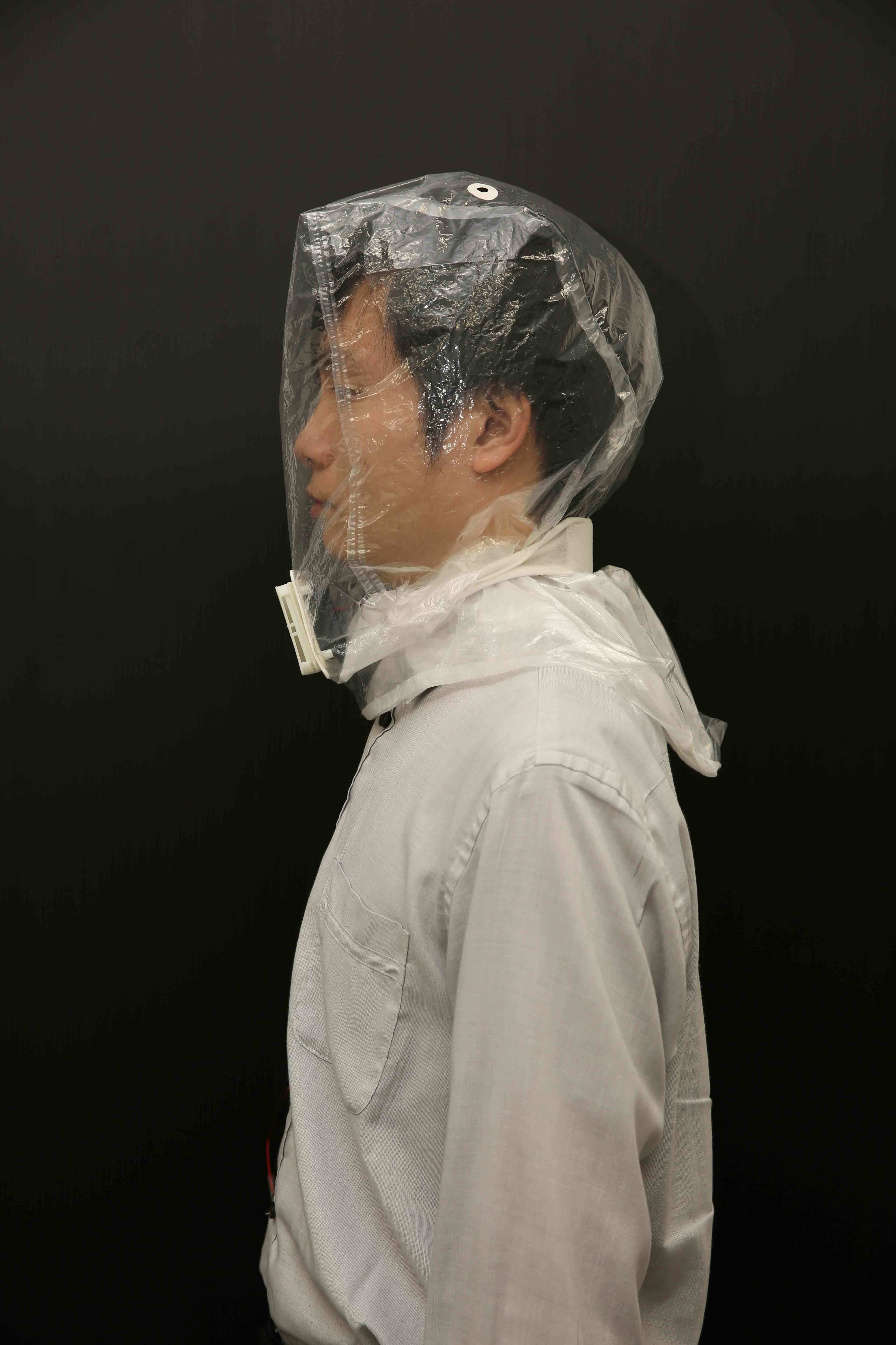 「空調フェイスシールド(TM)」とは、フィルタを装備したファンユニットを頭部にかぶるフィルムシールドに取り付け、浄化した空気を取り込むことによりシールド内部を陽圧(内部の圧力が外気圧よりも高い状態)にすることで、外部からの汚染物質に触れることなく快適に過ごすこのとのできる密閉型陽圧式フェイスシールドです。