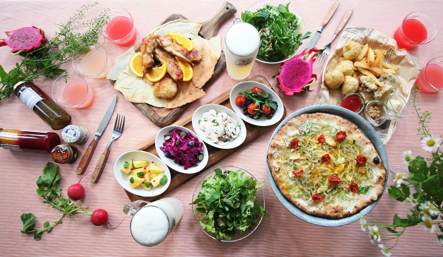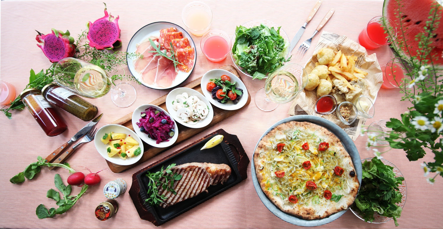 美容に嬉しい夏野菜やフルーツとハーブを組み合わせた色鮮やかな前菜、揚げたてのフィッシュ&チップス、からすみを使った贅沢ピッツァやメインディッシュまで充実したラインアップ。ドリンクは生ビールやスパークリングワイン、カクテルやサワー、カラフルなノンアルコールカクテルなども飲み放題でお楽しみいただけます。