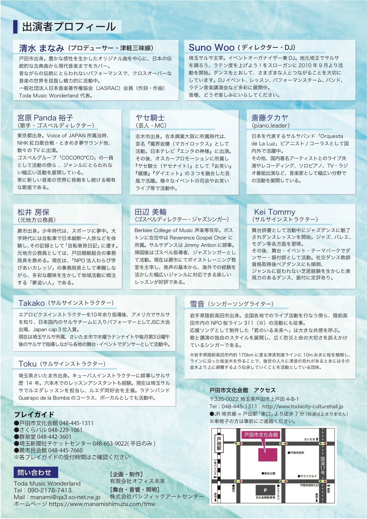 日本の民族楽器・津軽三味線奏者でイベントプロデューサーとしても活動している清水まなみと、キューバのダンス音楽「サルサ」を楽しむダンスチーム「埼玉サルサ」の主宰をつとめるSuno Wooが中心となって運営します。音楽には国を超えて民族を一つにする力があり、ラテン音楽を通じて、コンサートで出会った人たちの間に絆が生まれるような交流の場を提供します。