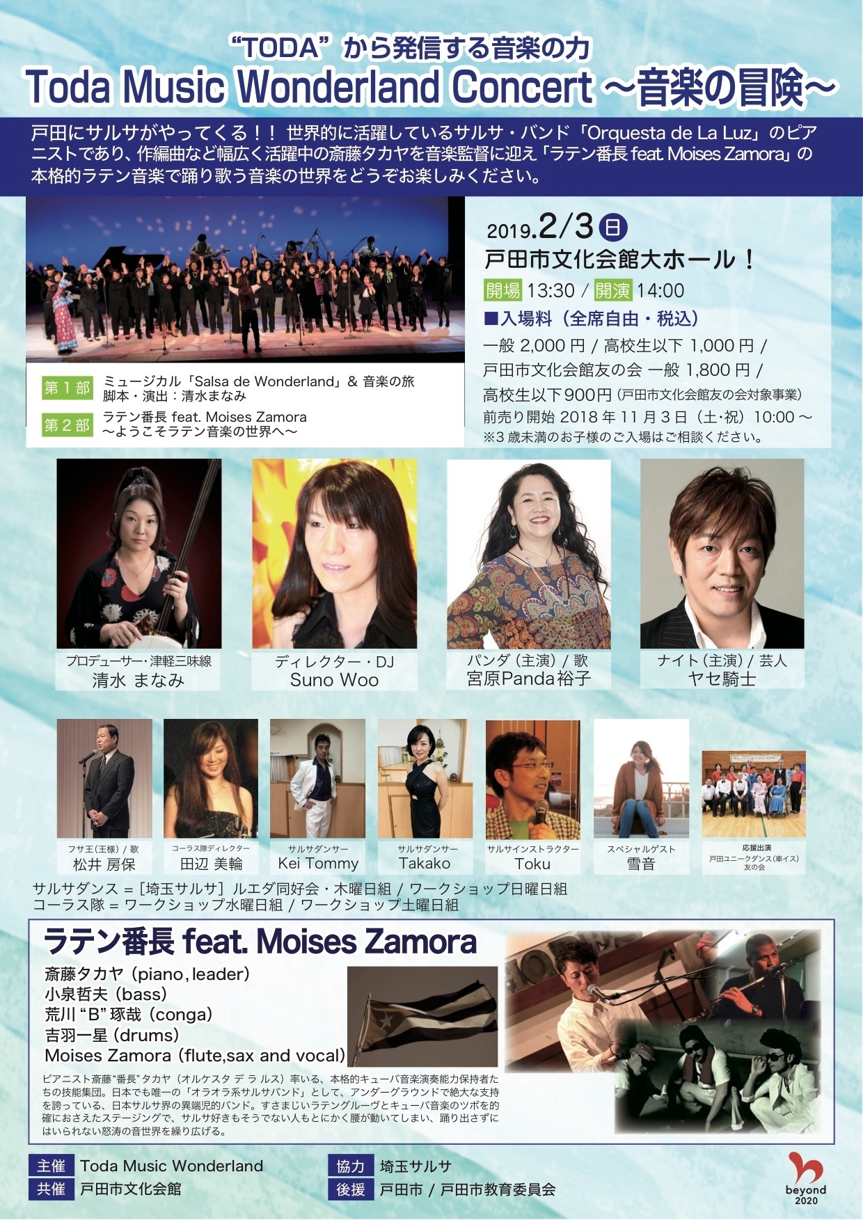 世界的に活躍しているサルサ・バンド「Orquesta de La Luz」のピアニストであり、作編曲など幅広く活躍中の斎藤タカヤを音楽監督に迎え、「ラテン番長 feat. Moises Zamora」の本格的ラテン音楽で踊り歌います。さらに、オリジナルミュージカル「Salsa de Wonderland」の中で踊るという、ラテン音楽界でも初の試みとなるコンサートになります。