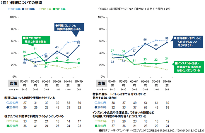 日々の食事にスーパーやコンビニで売っているお惣菜やレンジでチンするだけの便利なおかずを利用する方は多いのではないでしょうか。最近では、シニアがスーパーなどでお惣菜を購入している姿をよく見かけます。シニア女性の料理についての意識を見ると、「料理にはいつも時間や手間をかける」「材料選択・下ごしらえも自分でしないと気がすまない」という意識は、2013年に比べ減少傾向にあります。反対に、「後かたづけが簡単な料理を作る」「インスタント・冷食・惣菜などで料理の手間を省くようにしている」は増加傾向が見られます。就業率の伸びている60代女性だけでなく70代女性でもこれらの傾向が見られることから、シニア女性においても「より効率的に調理をしたい」という志向が高まっていると言えます。