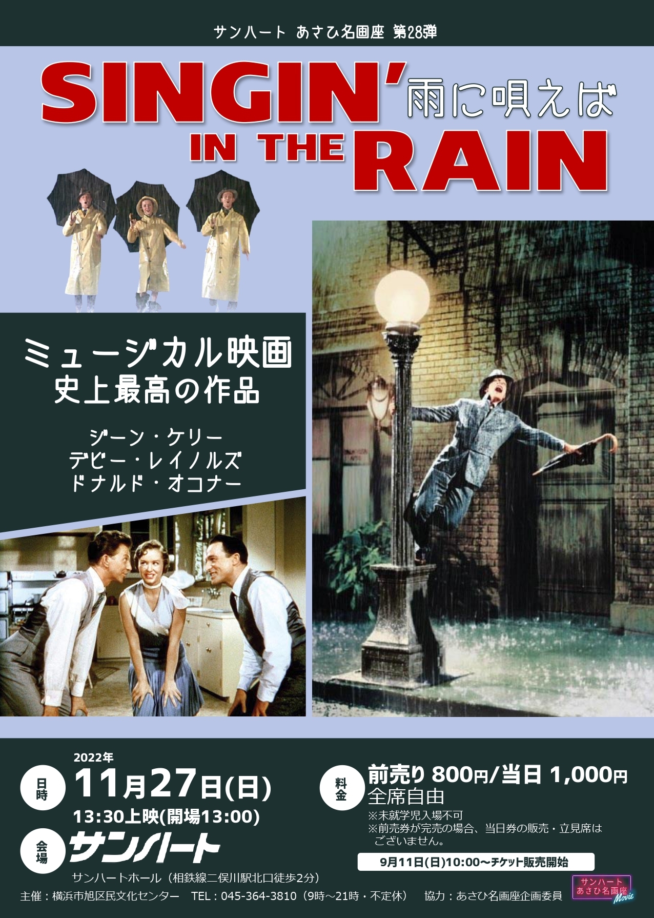 横浜市旭区民文化センター主催、サンハートあさひ名画座第28弾『雨に唄えば』が2022年11月27日 (日)に横浜市旭区民文化センター サンハート ホール(神奈川県横浜市旭区二俣川1-3二俣川ライフ5F)にて開催されます。