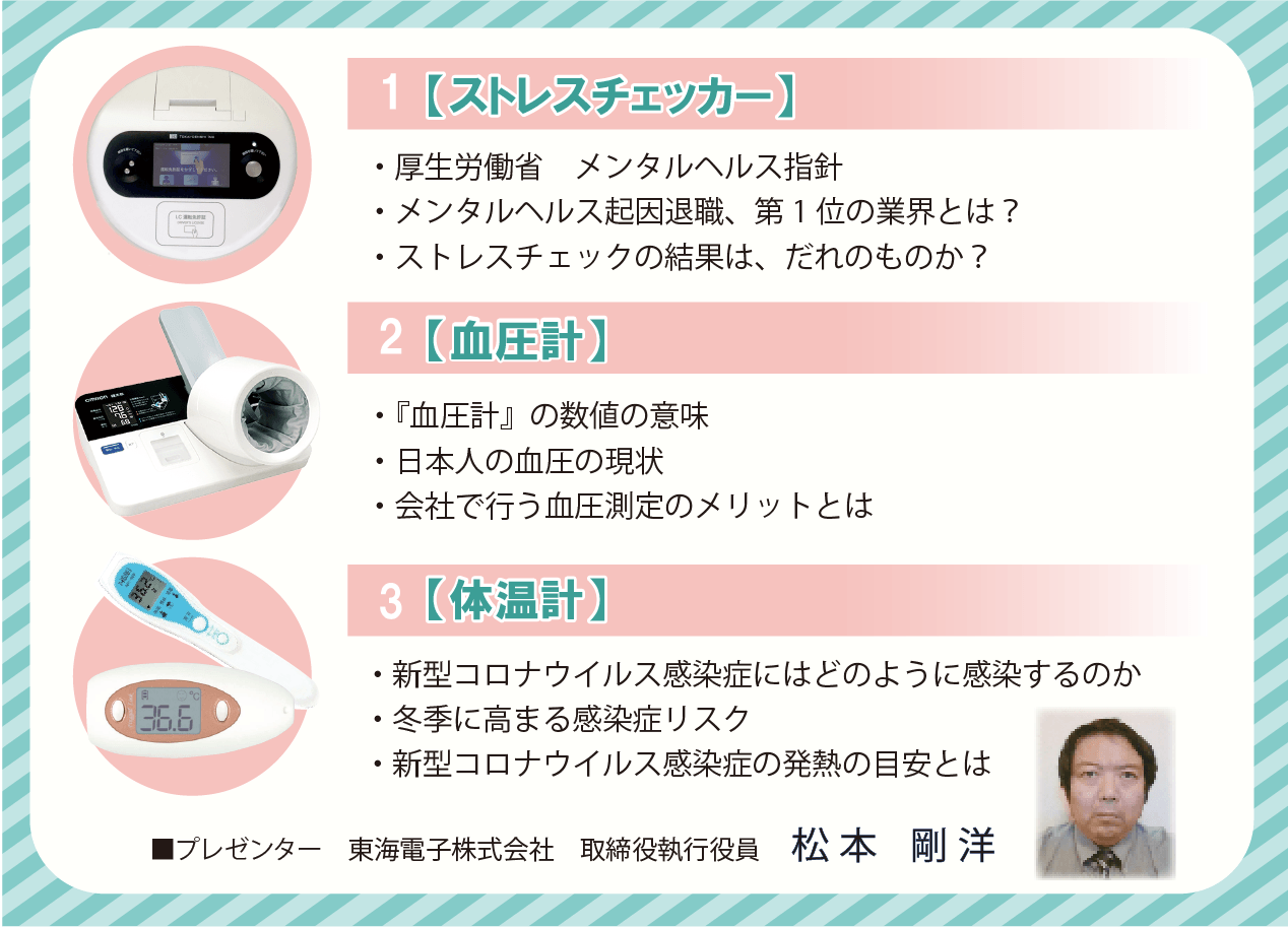 点呼機器およびアルコール検知器を開発・販売する東海電子株式会社(本社:静岡県富士市 代表:杉本 哲也)は、 この度、 「乗務員の安全・健康を守る新しい3つの健康管理機器」無料オンラインセミナーを開催いたします。