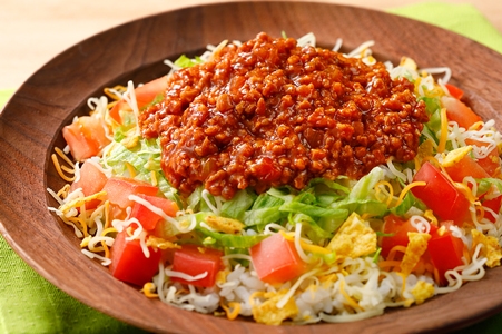 ごはん、パン、サラダなどにのせるだけで、手軽に主食や主菜が完成する、便利なタコスミートです。大豆ミート、たまねぎ、トマト、鶏そぼろに、クミンやオレガノなどのスパイスや、ハラペーニョをあわせて旨味豊かな味わいに仕上げました。2食分の使い切りが嬉しい小容量タイプです。