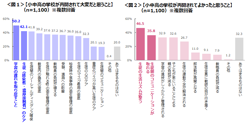 小中高の学校の再開により大変だと思うことは、約半数が「学習の遅れを取り戻すこと」と回答。「感染者・濃厚接触者となった生徒のケア」がそれに続く。