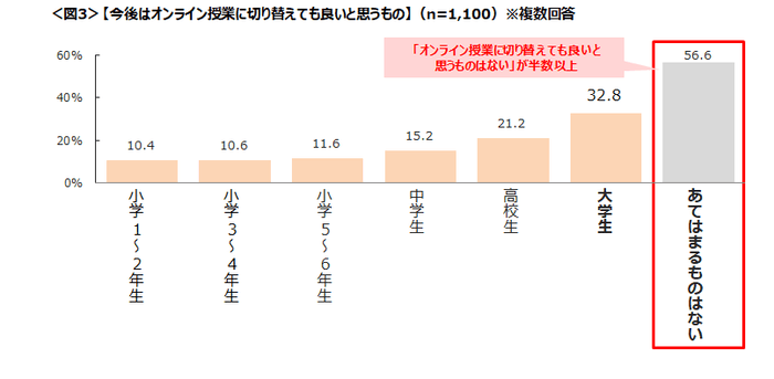 また、半数以上が「あてはまるものはない」と回答し、オンライン授業による教育に対して抵抗がある様子。<図3>