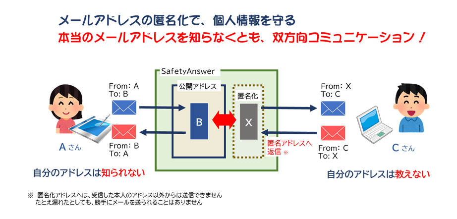 SafetyAnswerを通して受信するメールは、送信者アドレス毎に匿名化アドレスが割り当てられます。そしてメールの受信者へは、匿名化されたアドレスからのメール送信として届けられます。匿名化アドレスからは、本当のアドレスを割り出すことは不可能であり、SafetyAnswerシステムを通してメールを返信する以外に、メールの送信者へメールを届けることはできない仕組みとなっています。