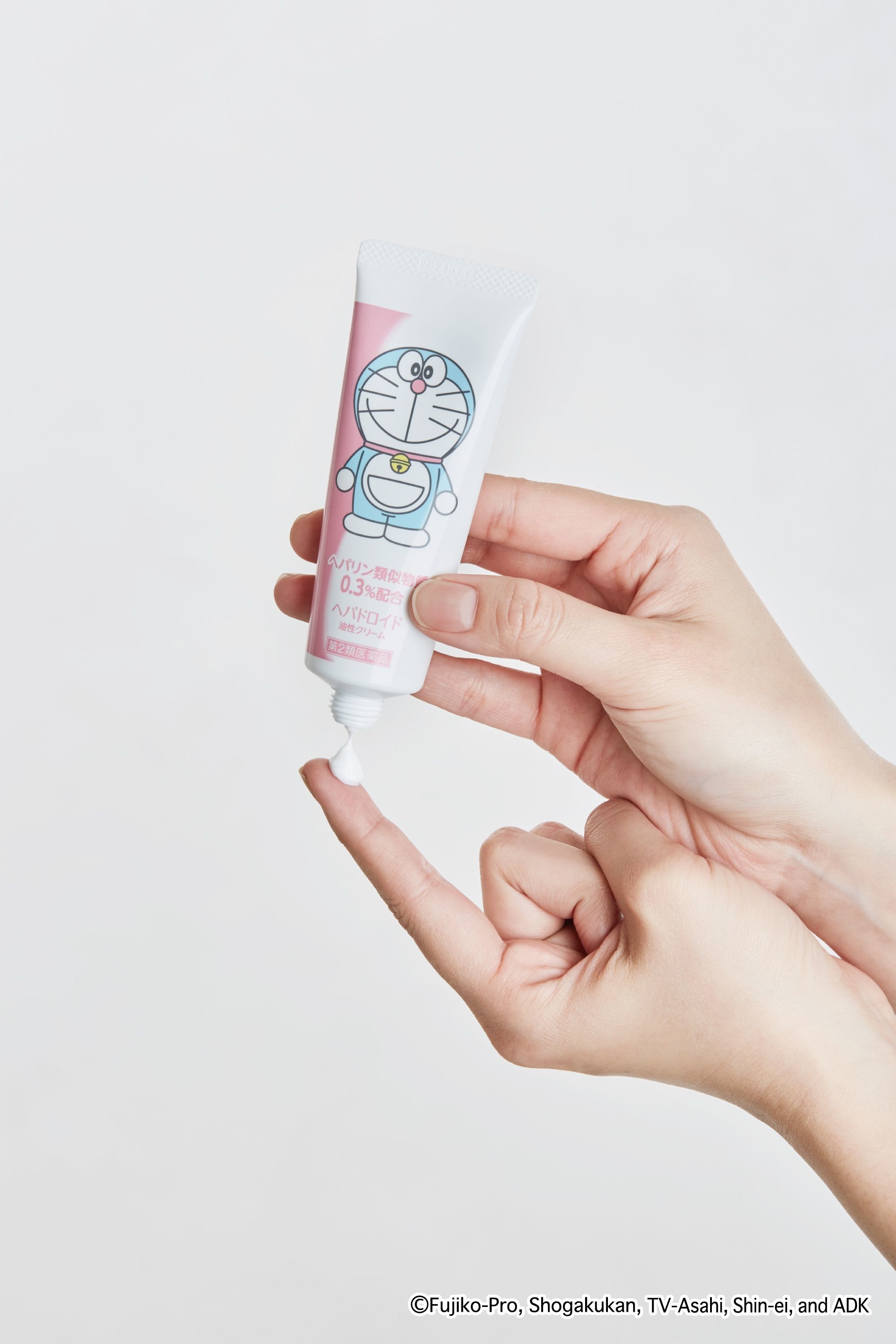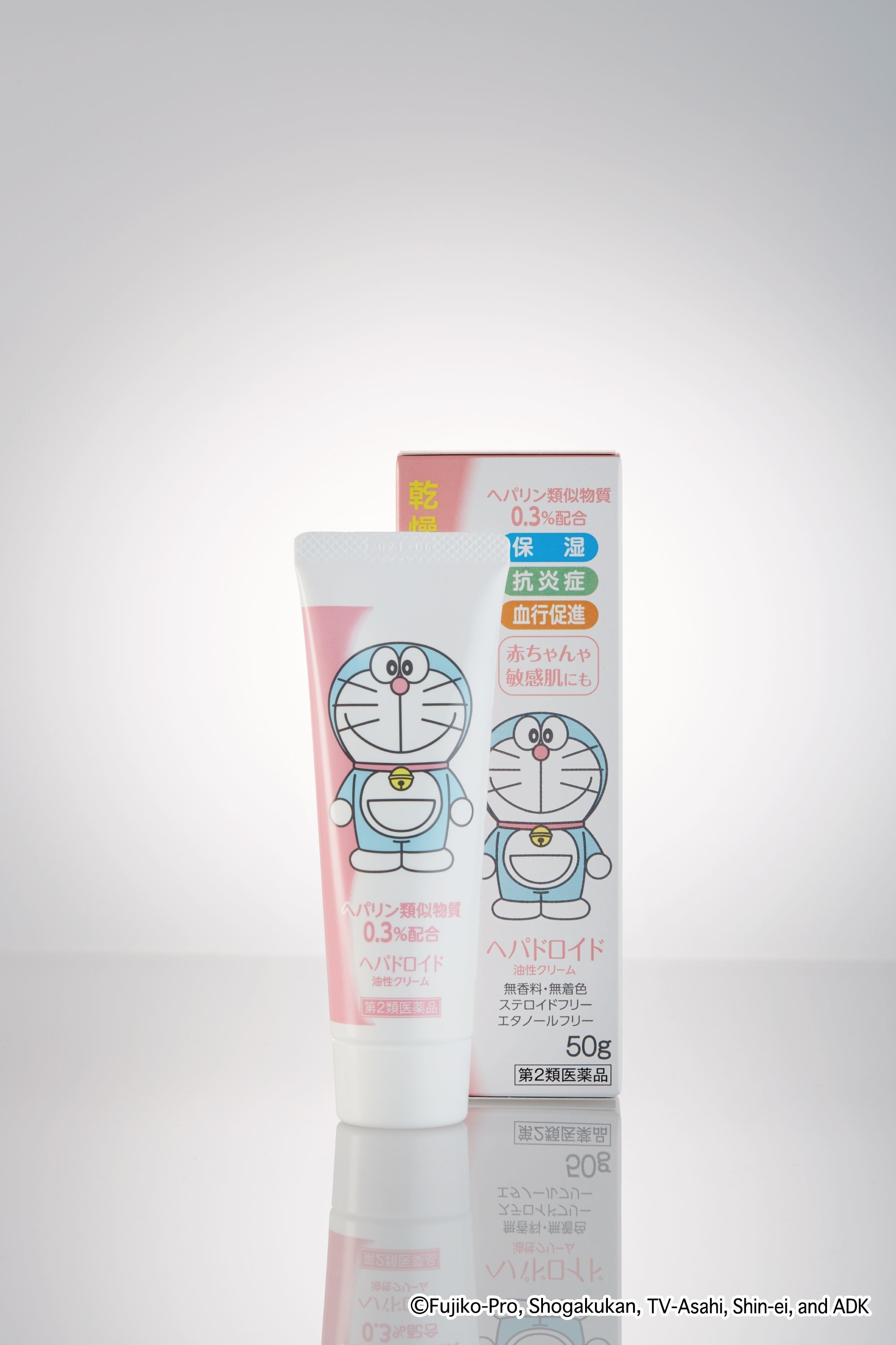 幅広い年代から愛される「ドラえもん」をパッケージに起用した「浅田飴のドラえもんシリーズ」は、2015年に乗り物酔い薬「トラベロップQQ」(第2類医薬品)を発売して以来大変ご好評いただいており、今回の「ヘパドロイド油性クリーム」で5品目となります。