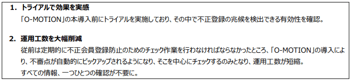一方で、上記体制に反した消費者への販売が課題となっており、流通体制の強化を目的に、不正会員登録の防止に向けて「O-MOTION」の導入を決定されました。