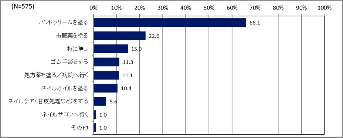手指の悩みへの対策として実施していることについての問いでは、60%を超える方が「ハンドクリームを塗る」と回答する一方、「ネイルオイルを塗る」「ネイルケア(甘皮処理など)をする」「ネイルサロンへ行く」という回答は、少数にとどまるという結果になりました。