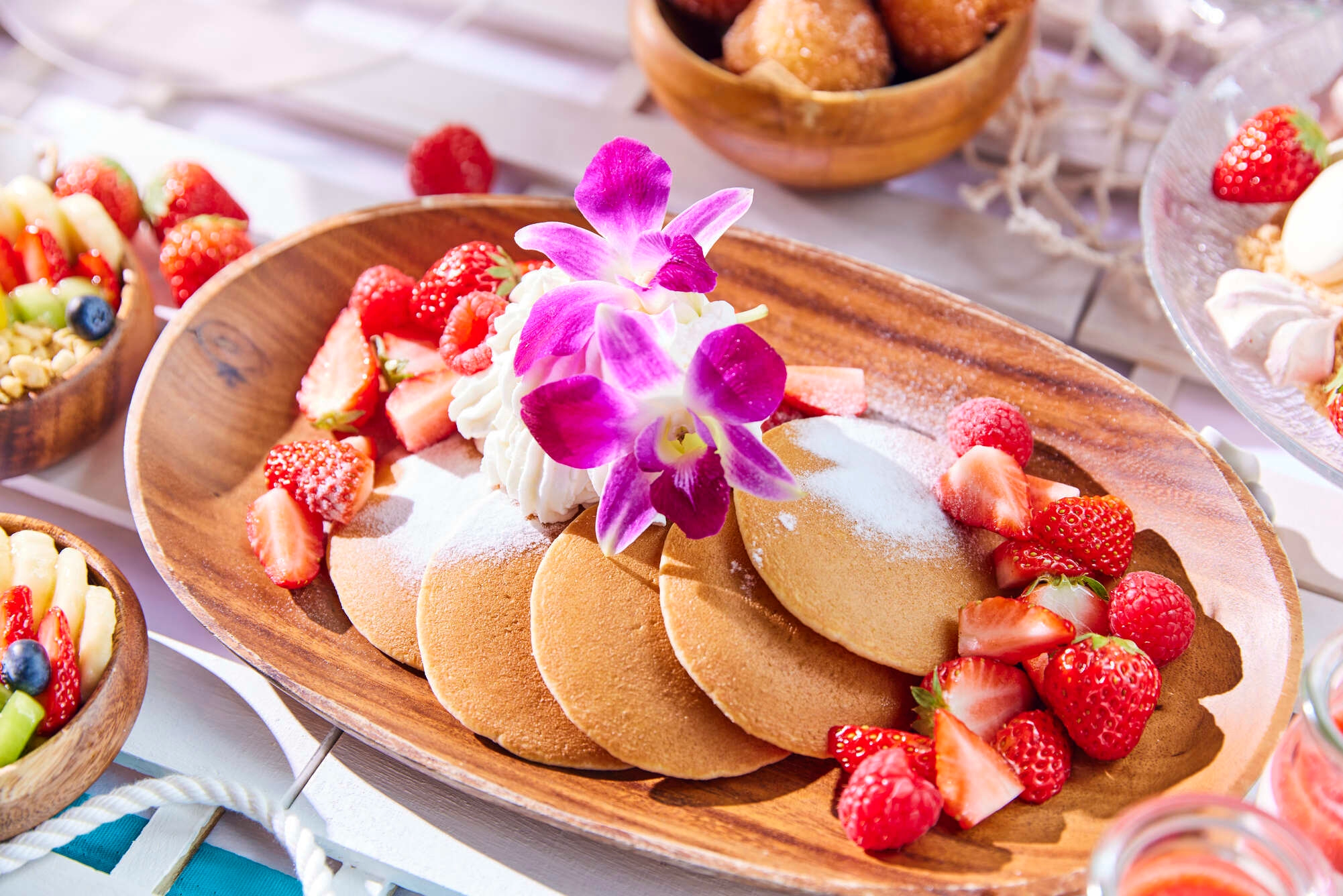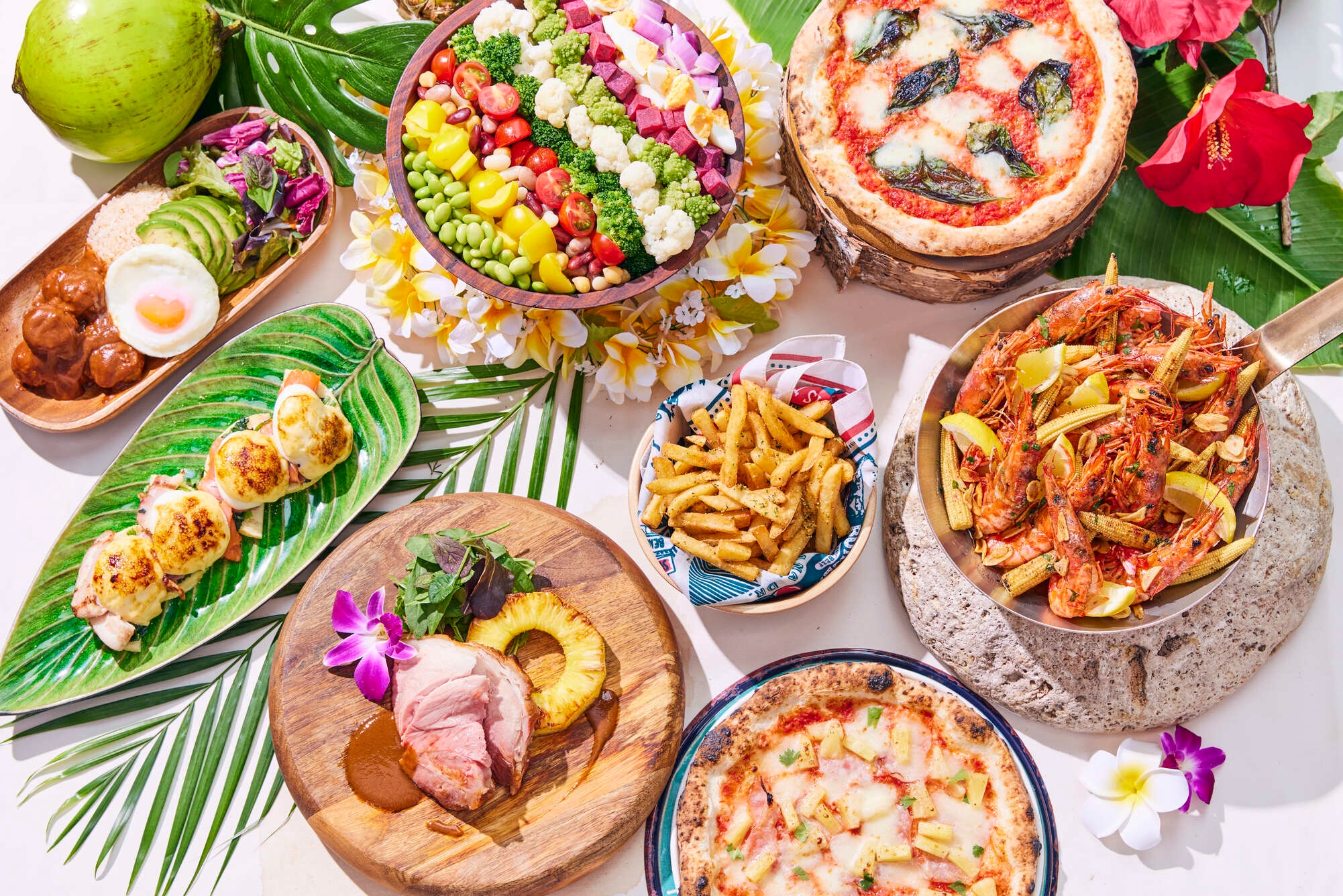 ハワイアンリゾートをテーマにガーリックシュリンプやアサイーボウルなどハワイならではの定番メニューを取り入れたブッフェをご用意。ライブスタイルで焼き立てをご提供するハワイアン・パンケーキはオリジナルのホイップクリームやトロピカルフルーツのお好みのトッピングでお愉しみいただけます。店内は都内にいるとは思えない落ち着いた空間と、大きな窓から差し込む光が心地よい空間を演出しています。