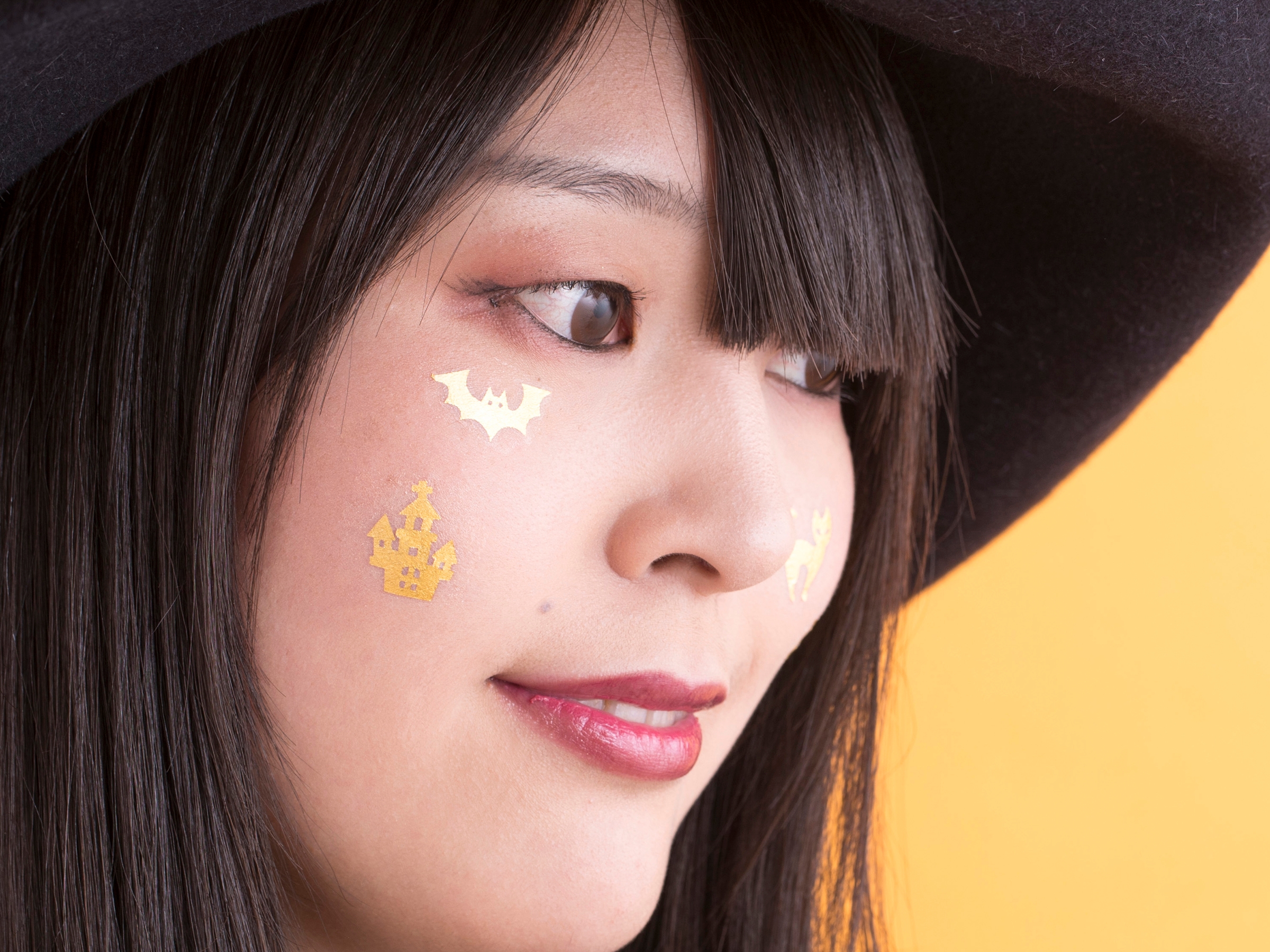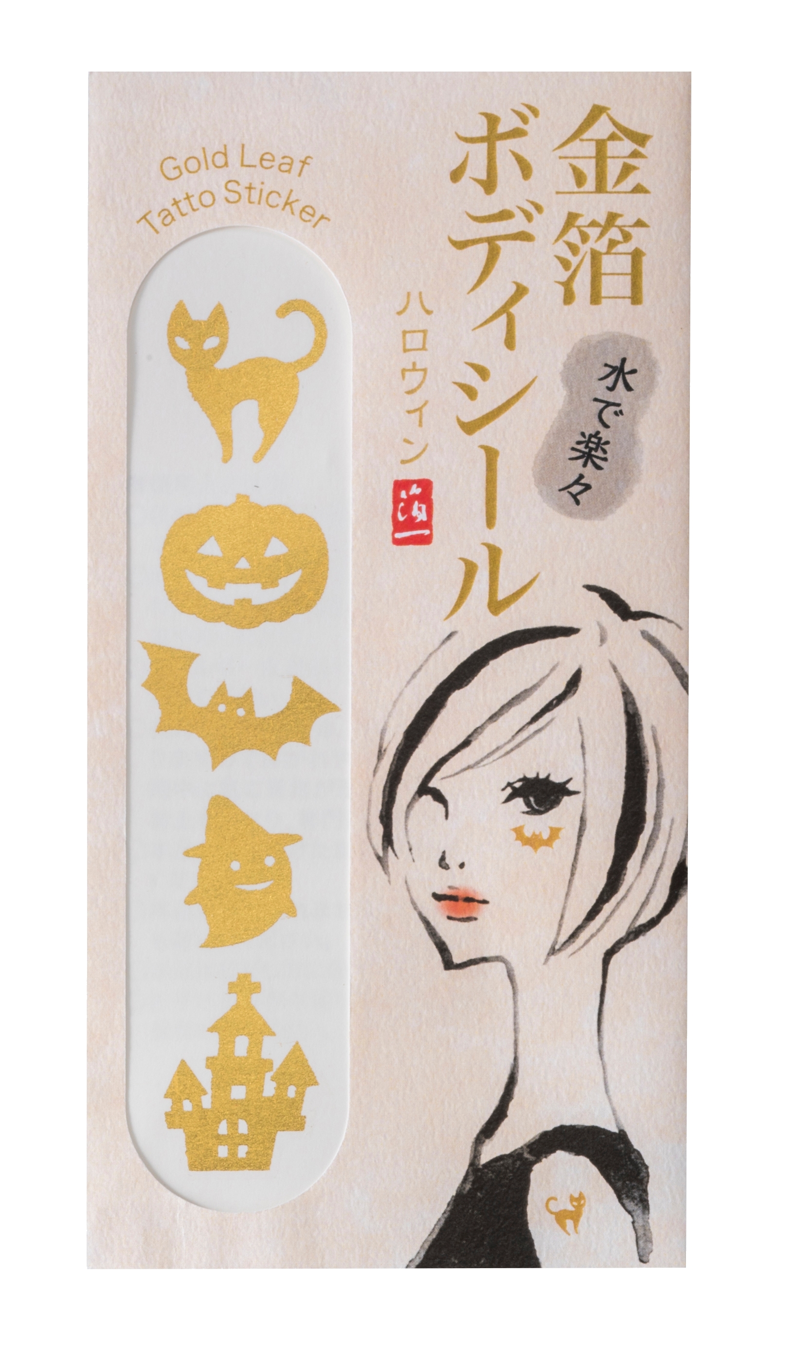 (3) 2002年のワールドカップの際に商品開発に成功した『金箔タトゥーシール』をより身近に楽しめる商品として、再開発。ワールドカップの際にJAPANと顔に貼って応援するスタイルは当時話題となりました。気分を盛り上げるアイテムとして、今回ハロウィンバージョンにリニューアル。「黒猫」「かぼちゃ」「コウモリ」「おばけ」「お城」の5種を揃えた「金箔ボディシール」として発売します。どなたでも気軽にお顔や、首、腕などに貼りハロウィン気分を盛り上げてくれます。
