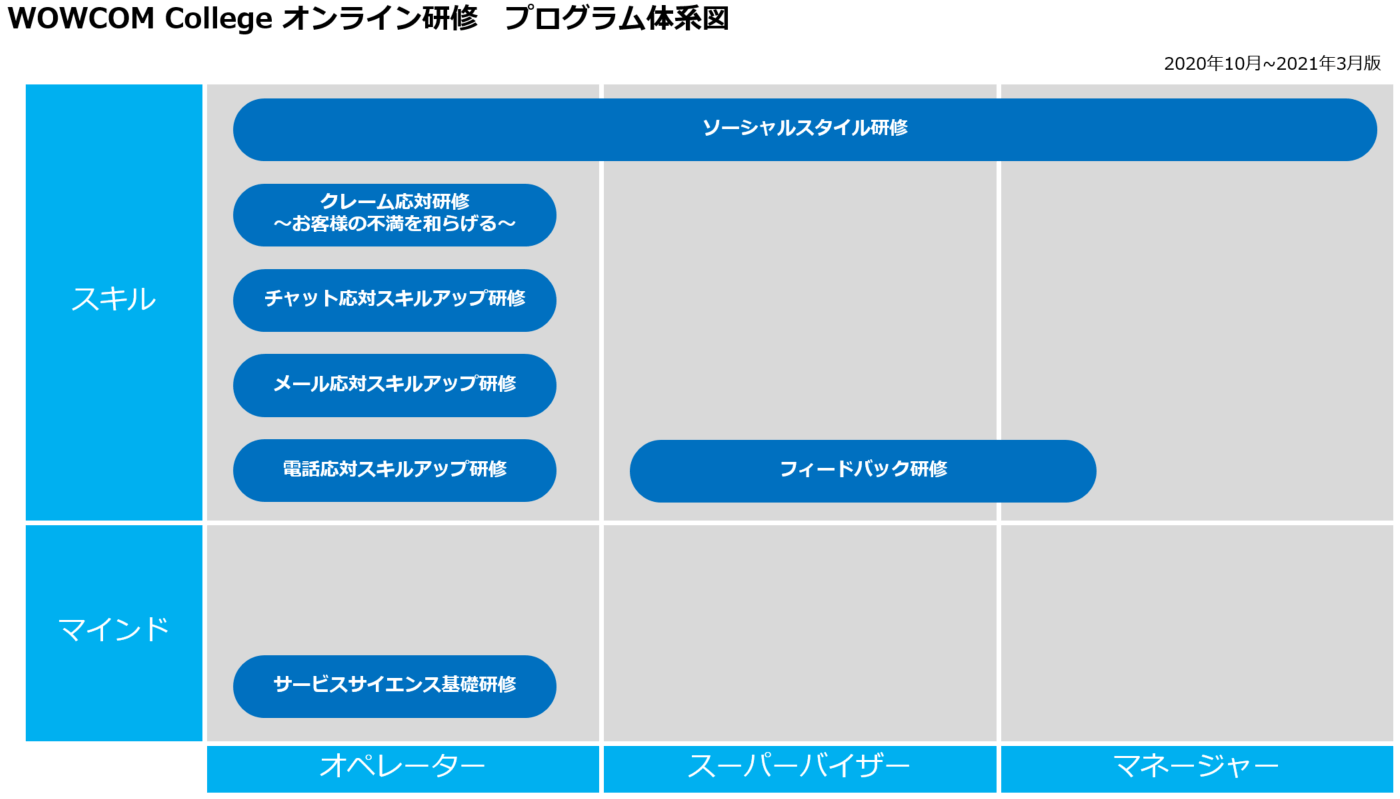 株式会社WOWOWコミュニケーションズ(本社:神奈川県横浜市、代表取締役社長:大高 信之)は、これまで対面型でご提供してまいりましたコールセンター向け研修をオンラインにてご提供する新サービス「WOWCOM College(ワウコム カレッジ)オンライン研修」を開始いたします。3密回避のため集合研修の運営にも配慮が求められるほか、在宅勤務の普及など、コールセンターの人材育成は大きな変化に直面していますが、顧客サービス品質の維持向上を図る上で、従業員のスキルアップを止めるわけにはいきません。その課題を「WOWCOM College オンライン研修」は解消します。