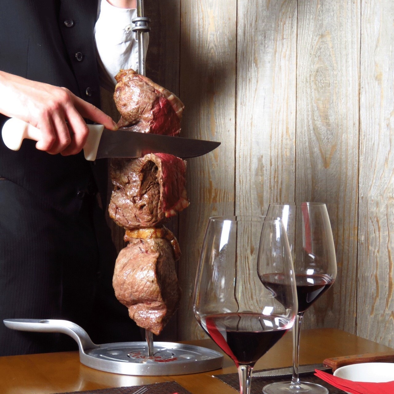 牛、豚、鶏などのお肉はもちろん、新鮮野菜や焼きチーズ、隠れ人気No1の焼きパイナップルなど20種類以上をブラジル直輸入の専用シュラスコマシーンを使用し、焼き加減に拘ってお客様のテーブルにお持ちし、お好みの大きさにお切りいたします。すべて食べ放題です。