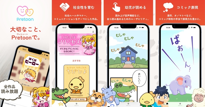 『Pretoon』は、幼児が自ら読み進めることができる、読み上げ音声機能付き縦読みコミックアプリです。