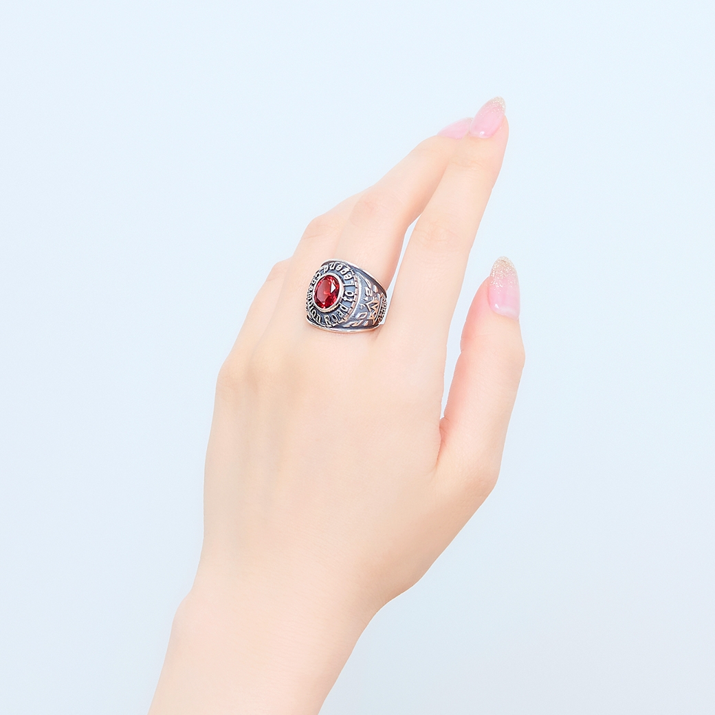 燻加工を施したシルバー925製のリングに、「BAE」のエンブレムや3人の名前、MCネームなどを取り込んだデザイン。中央にはチームのイメージカラーストーンをセットしました。