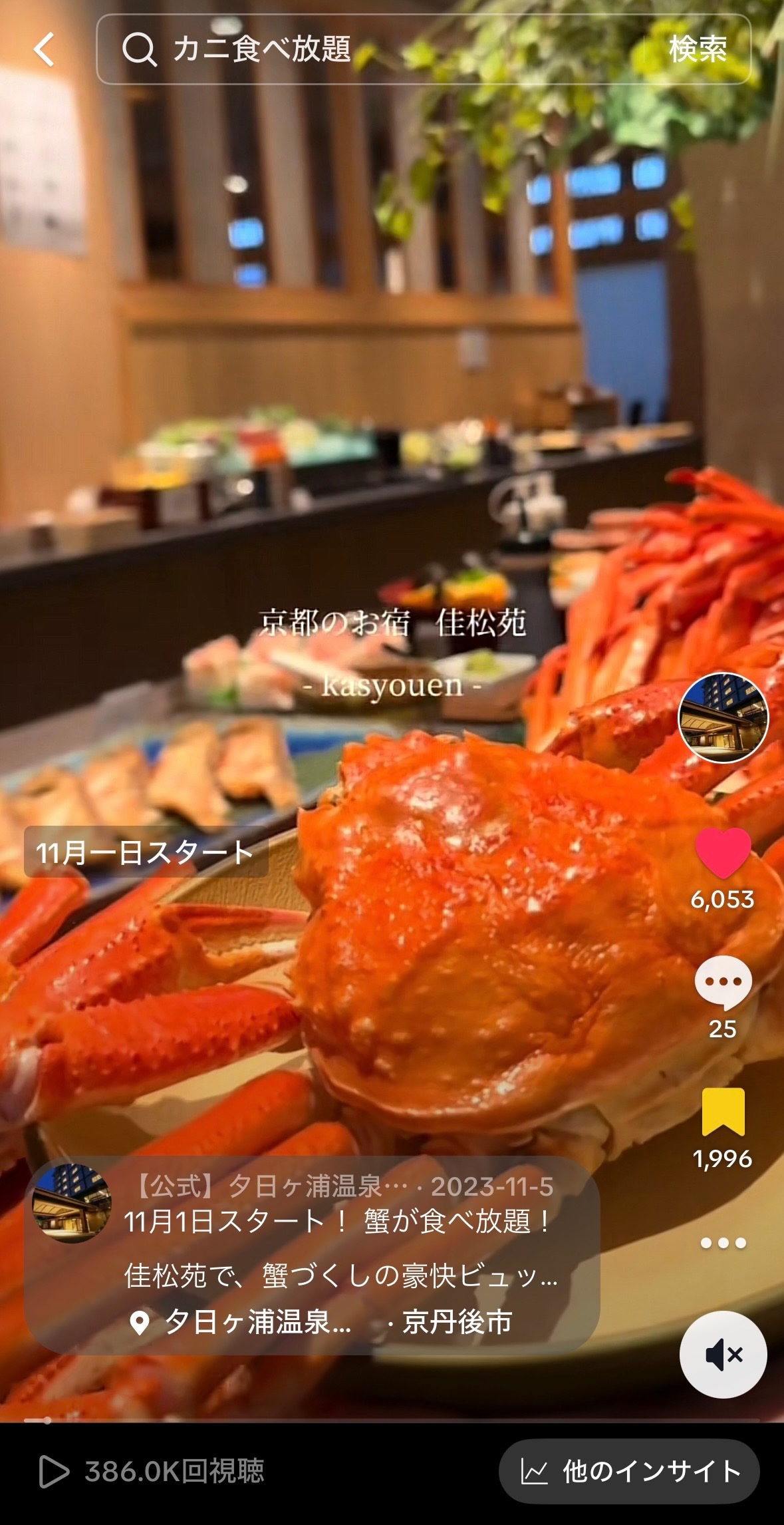 TikTokで話題を呼んだ【佳松苑のカニづくし豪快ビュッフェ】の動画が 38 万回再生を突破しました