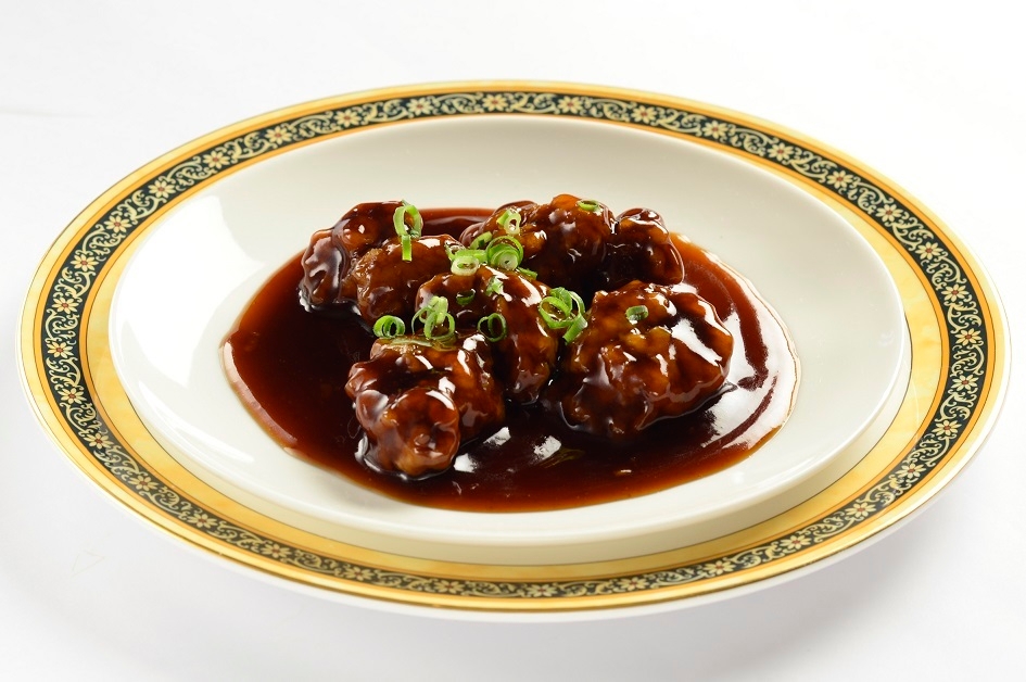 肩ロースを大きめの一口サイズに切り分け、高温でカリカリに揚げたものを、鎮江香醋という黒酢を煮詰めて作った甘酸っぱい餡に絡めて仕上げました。肉の旨味と鎮江香醋の濃厚な風味とまろやかな酸味が凝縮された、一風変わった真っ黒な酢豚です。鎮江香醋は「中国三大酢」の一つに数えられる銘醸で、独特の香りとコクは食欲を刺激します。化学調味料(アミノ酸等)や保存料、着色料を一切使用していない本格的なレシピは聘珍樓ならでは。ヘルシーで身体に優しい黒酢とお肉の旨味をたっぷりと堪能できる一品です。