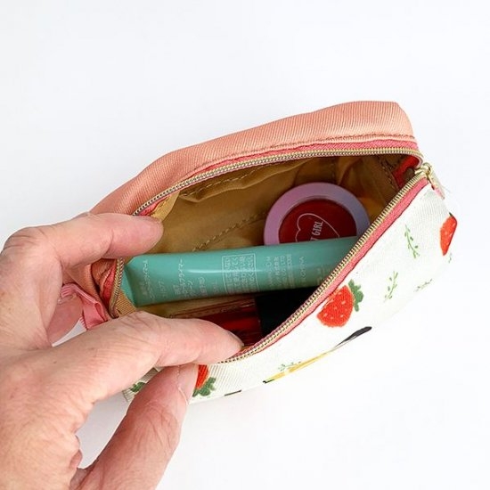 今回ご紹介するポーチは2種類です。まず1つめはこちらのフルーツいっぱいキャラメルポーチ♪フルーツにちょこんと乗った2匹が可愛すぎるデザイン。
