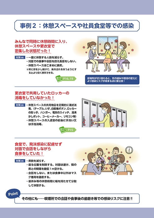 本事例集は、東北大学病院 感染管理室の監修のもと、11月27日に厚生労働省が公表した「新型コロナウイルス感染症(COVID-19)に係る職場における集団感染事例」と市内での発生状況を基に、職場内で集団感染が発生した原因として考えられることとその対策を、イラストを用いて4つの事例を挙げて分かりやすく解説している。