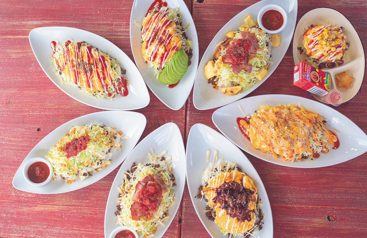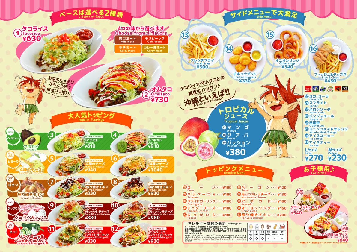 看板メニューである[オムタコ](商標登録5115805号)とタコライスをベースにミートの味を甘口、中辛、カレー味、チリビーンズの4種類から選べることに加え様々なトッピング(アボカド、照り焼きチキン、4種のチーズ、ベーコン&モッツアレラチーズなど)を選べることで、味も彩りも無数の組み合わせを楽しめることから、沖縄のタコライス店として人気のお店となっています。