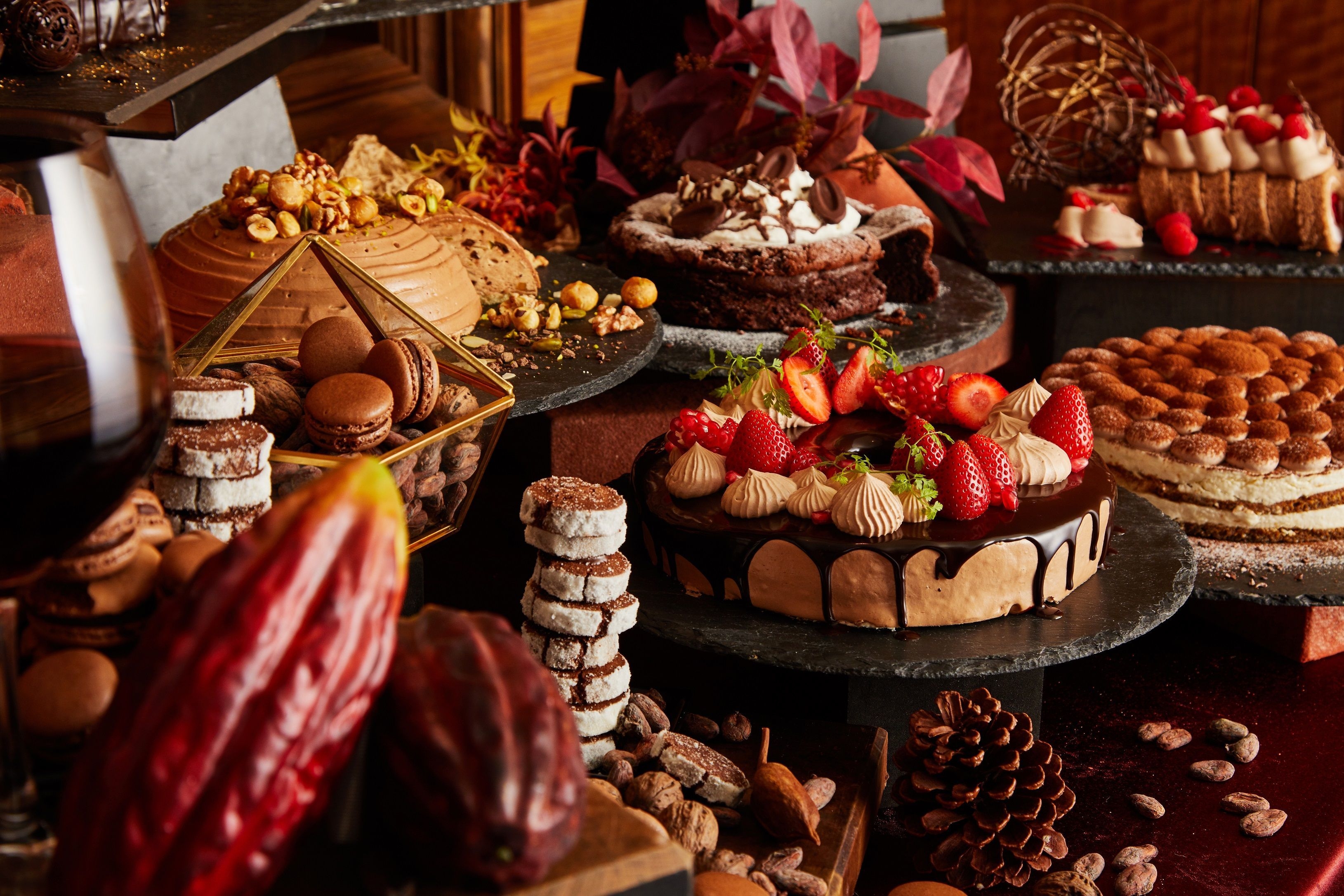 チョコレートファウンテン、しっとりガトーショコラ、ディアマンショコラ、チョコレートテリーヌ、トリュフ、生チョコレート、チョコレートとナッツのタルト、チョコバナナショートケーキ、チョコレートムース、マカロン ショコラ、チョコレートロール、ティラミス、チョコレートのズコット、ホットココア、チョコクレープ