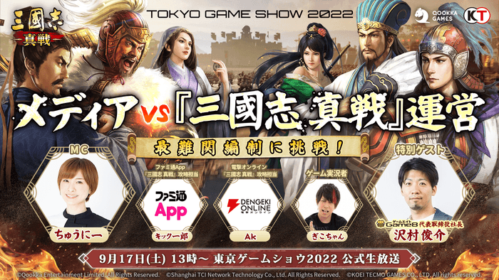 Qookka Entertainment Limitedが、株式会社コーエーテクモゲームスの歴史シミュレーションゲーム『三國志13』のIPを使用し、同社監修の元で開発されたスマートフォン向けゲームアプリ『三國志 真戦』は、2022年9月17日(土)13時から、東京ゲームショウ2022にて生放送番組を配信いたします。